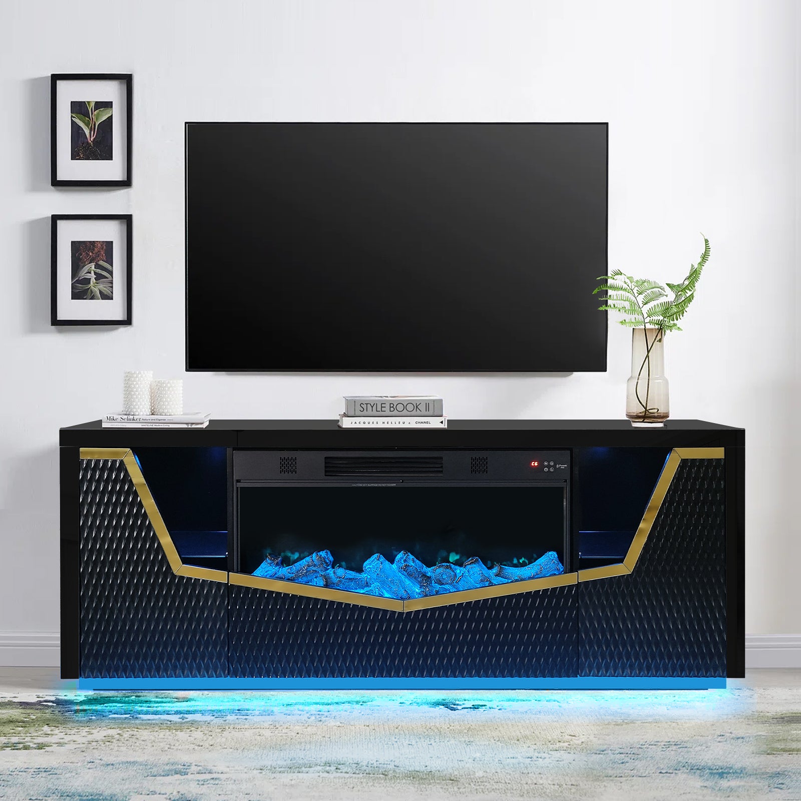 The A-F11 Carmela transforms any room into a cozy retreat with its sophisticated black finish and multifunctional design. Enjoy customizable ambient lighting in multiple colors that sets the perfect mood, while the integrated heating system keeps you warm and comfortable. The built-in Bluetooth speaker delivers your favorite music seamlessly, and the dual-door fireplace features mesmerizing flame effects in various colors for authentic ambiance without the hassle. Perfect for creating an inviting atmosphere in your living space while enjoying modern convenience and style.