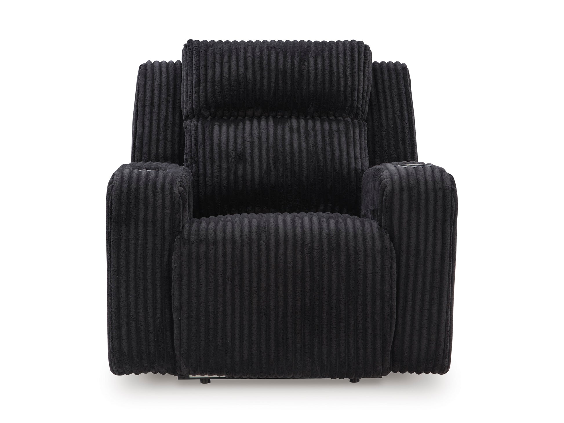 Trend-right style, meet irresistible modern function. Your living room gets a cozy-cool upgrade with this power recliner. Curl up in its ultra-chic corded upholstery and recline with one-touch controls. Is it movie night or game time? With ambient LED lighting, this recliner transforms from a serene relaxation spot to an entertainment hub. USB charging, cup holders and storage cutouts make lounging all the more convenient.