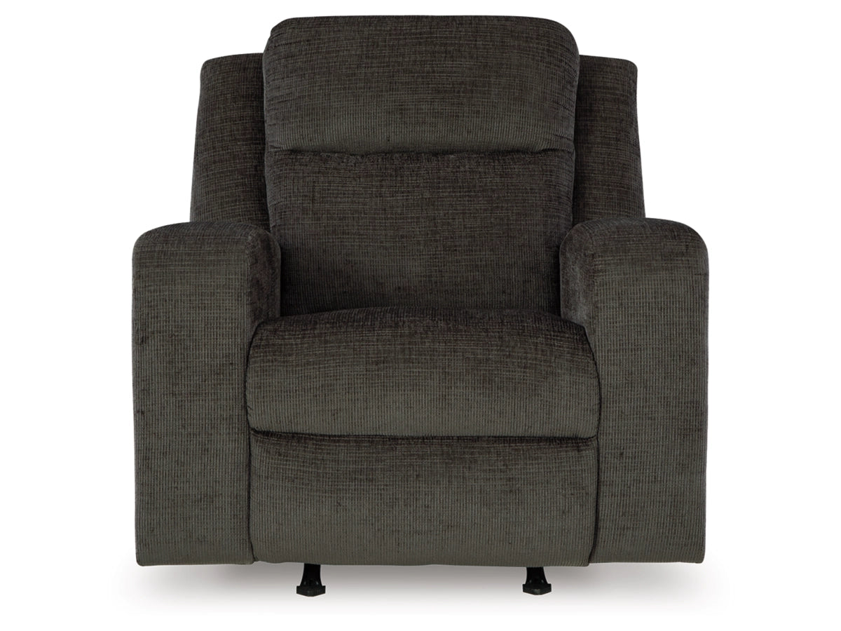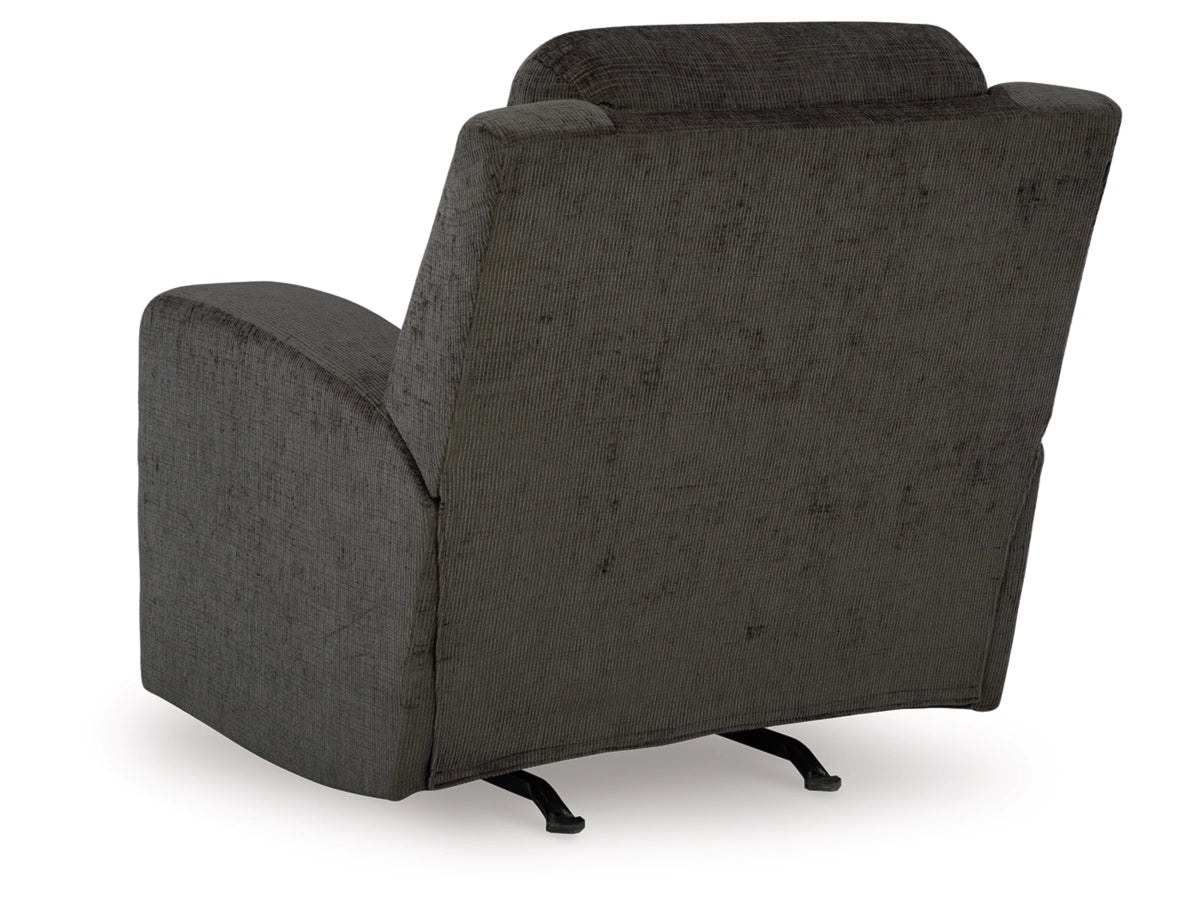 Indulgent comfort meets fashion-forward flair in this rocker recliner. Its luxuriously soft upholstery and captivating color show off your cozy yet smart style. Sleek track arms infuse a modern sensibility, while the gentle rocking motion makes this piece even more inviting. Simple pull tab reclining puts endless relaxation within easy reach.