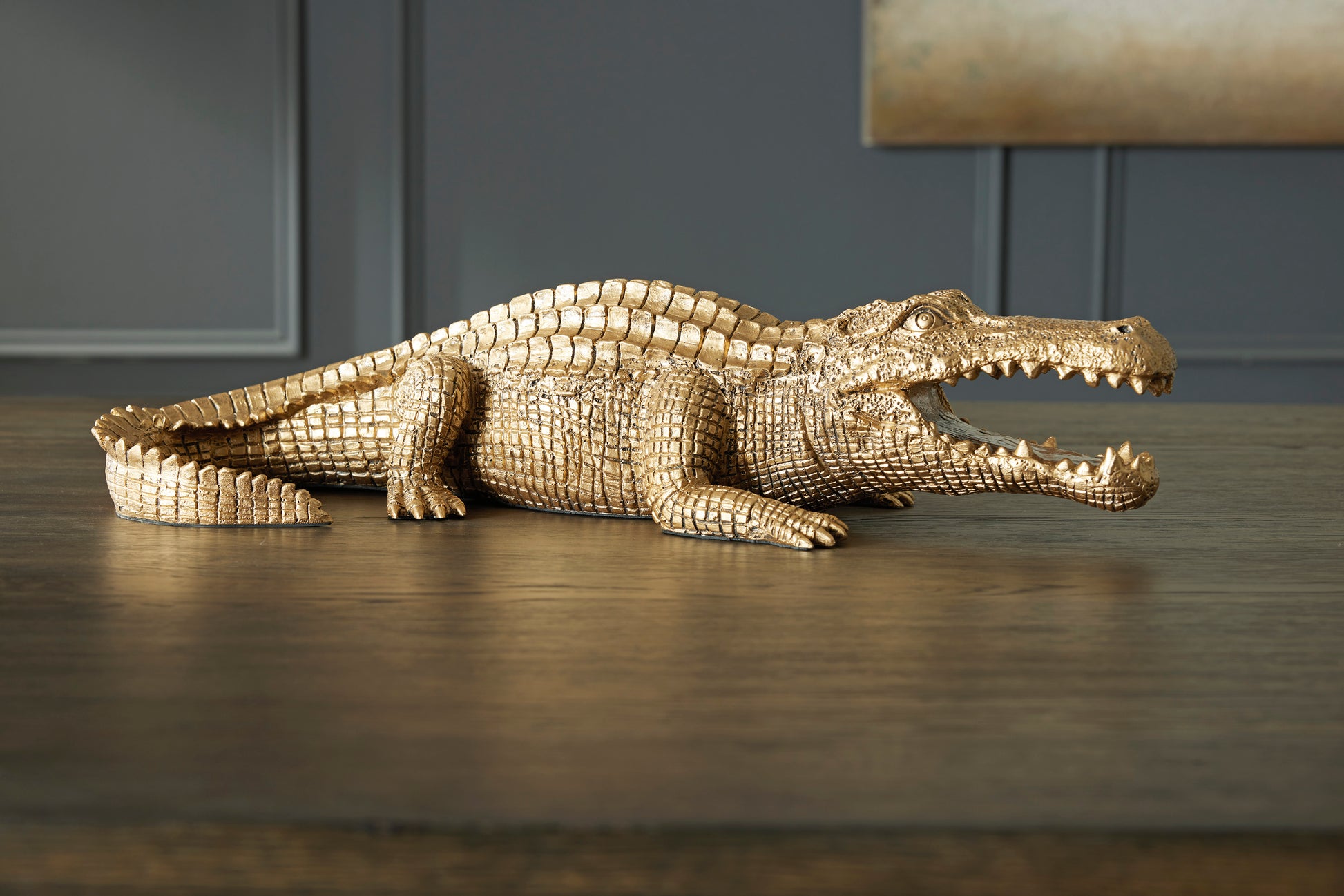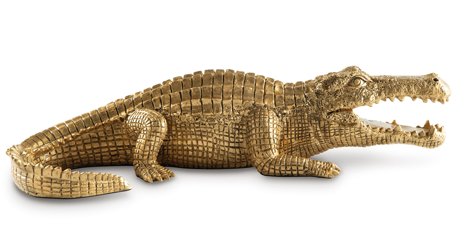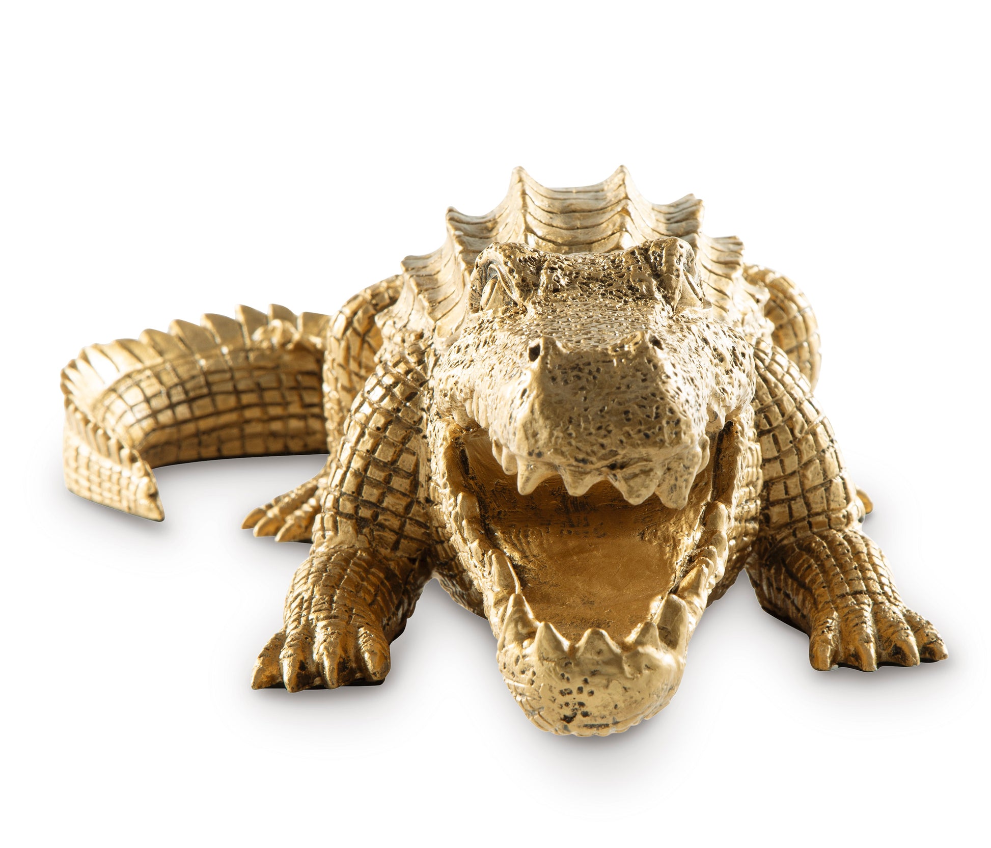 This sculpture brings a glam appeal to wild style. Luxe in an antiqued goldtone finish, the alligator-shaped art piece is a snappy addition to your office or living room decor. Its remarkable attention to detail captures the animal's likeness in decidedly contemporary fashion.
