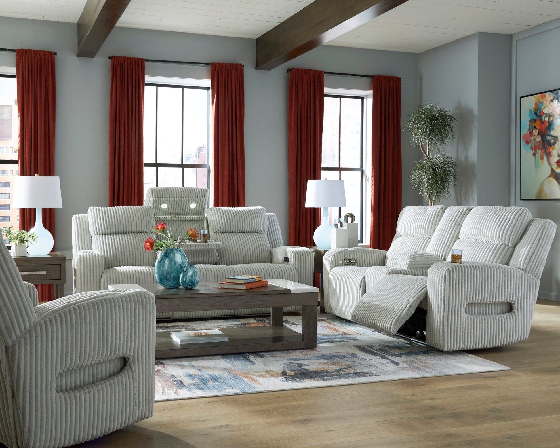 Trend-right style meets modern function with the TwinBrooke power reclining collection. Cozy up in ultra-chic corded upholstery and enjoy one-touch reclining, ambient LED lighting, and convenient features like USB charging, cup holders, and storage. From movie nights to game time, it’s your go-to entertainment hub.