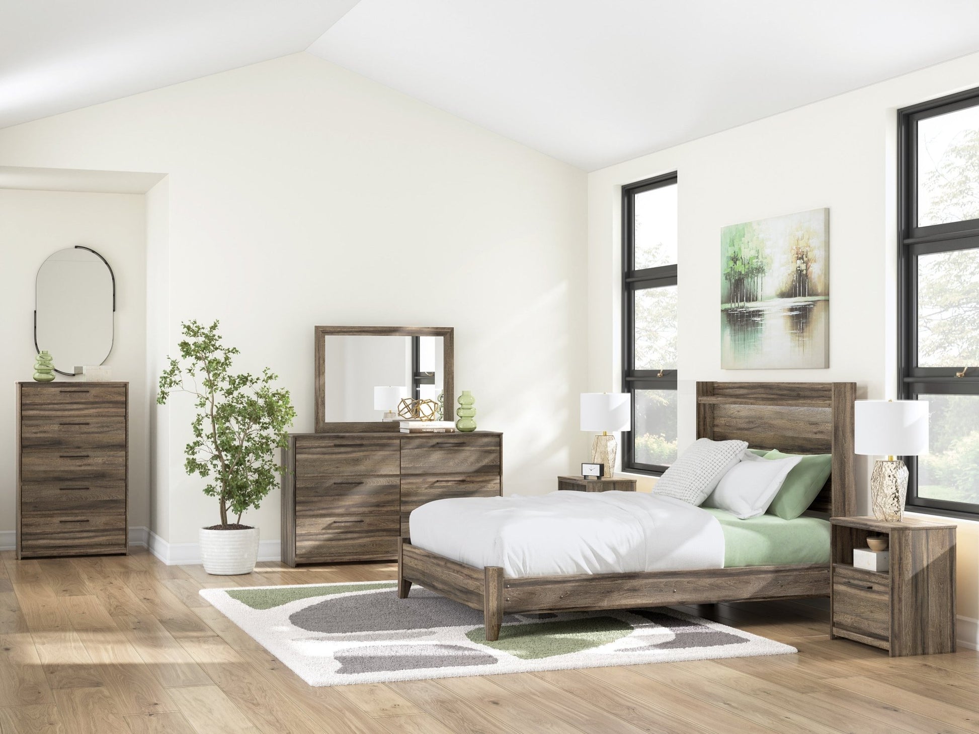 The Elbrim collection from Signature Design by Ashley blends casual comfort and modern utility, offering a cohesive suite that includes dressers, mirrors, chests, panel beds, and nightstands. Each piece is crafted from engineered wood with a decorative laminate in a weathered brown finish over replicated oak grain to evoke an “authentic touch.” The panel beds feature integrated dimmable LED lighting under shelf overhangs, while nightstands include USB‑A and USB‑C charging ports. Smooth‑gliding drawers, faux linen drawer linings, and clean‑lined, fuss‑free silhouettes complete the design, making Elbrim both functional and stylish.