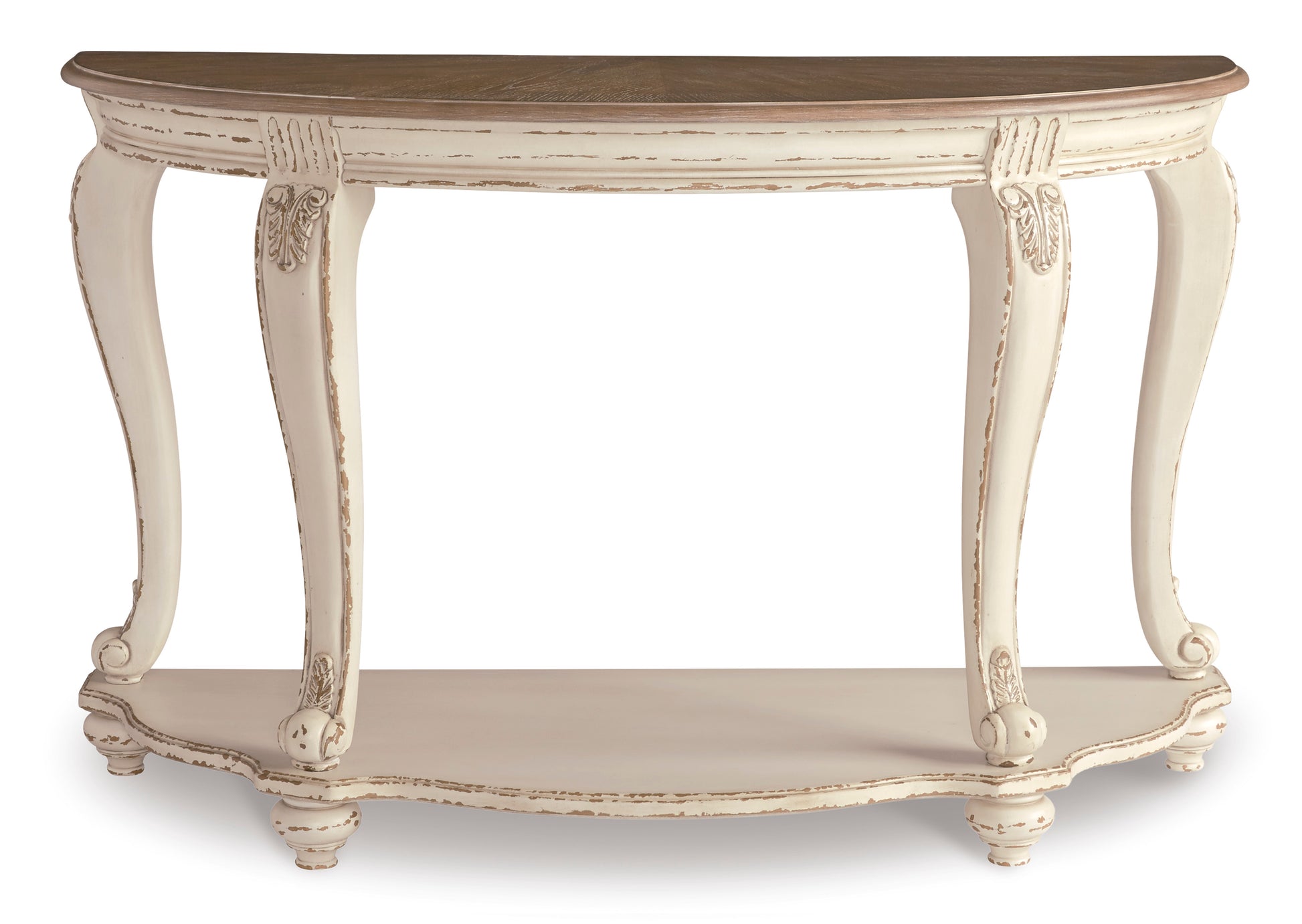 Elevating the art of traditional cottage styling, this demilune sofa table is sure to serve you beautifully for years to come. Antiqued two-tone aesthetic blends a chipped white with a distressed wood finished top for added charm. Classic cabriole legs and shapely lower shelf are a lovely twist. Decorative corbels add refinement.