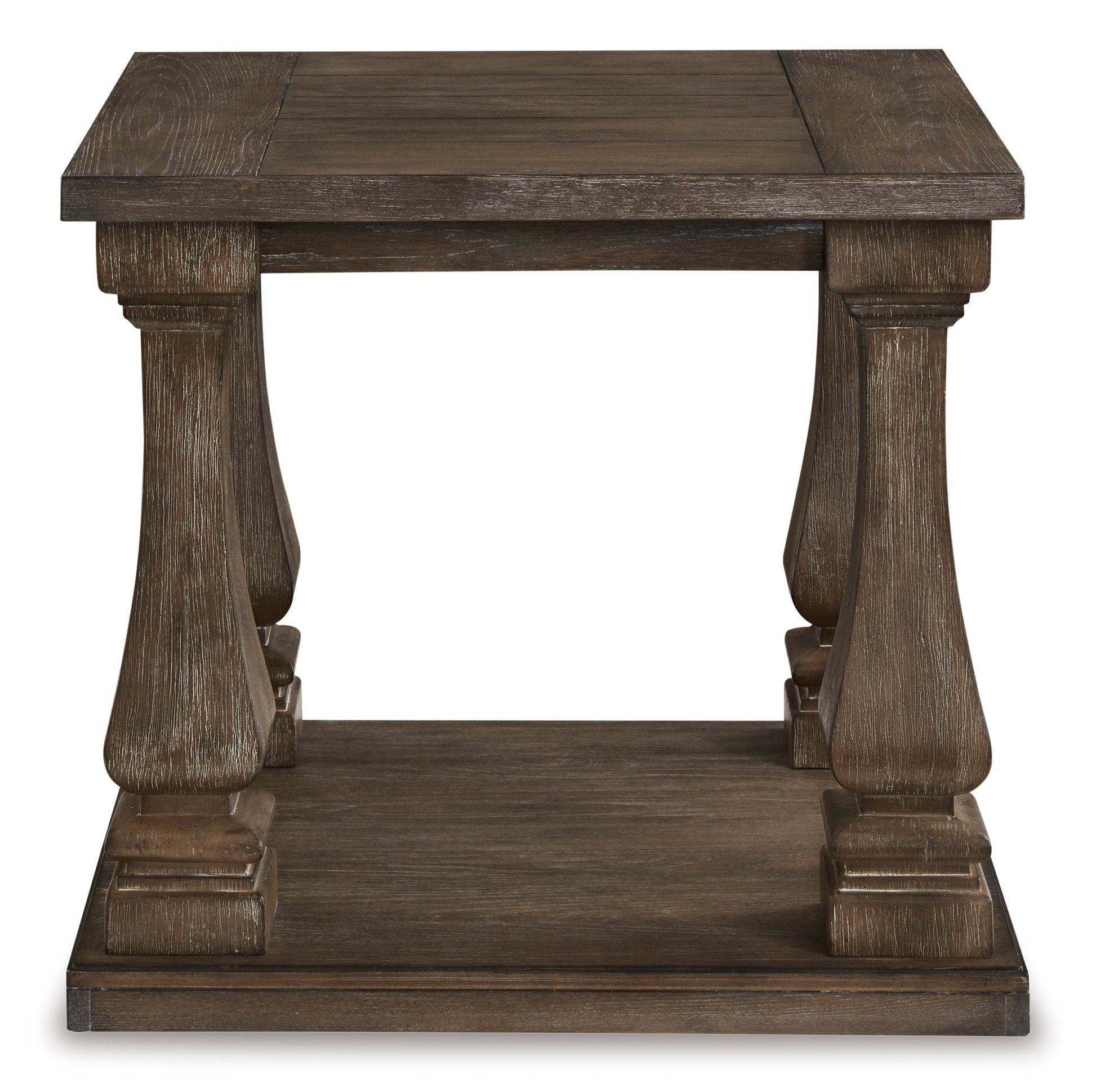 Homey. Hearty. Heavenly hued. Luring with a distressed weathered gray finish and square baluster legs set on a broad lower shelf for great presence, the Johnelle end table is sure to make your homestead feel that much more like home. The look is beautified with elm veneers and a framed and plank-effect tabletop for a richly crafted masterpiece made for years of satisfaction.