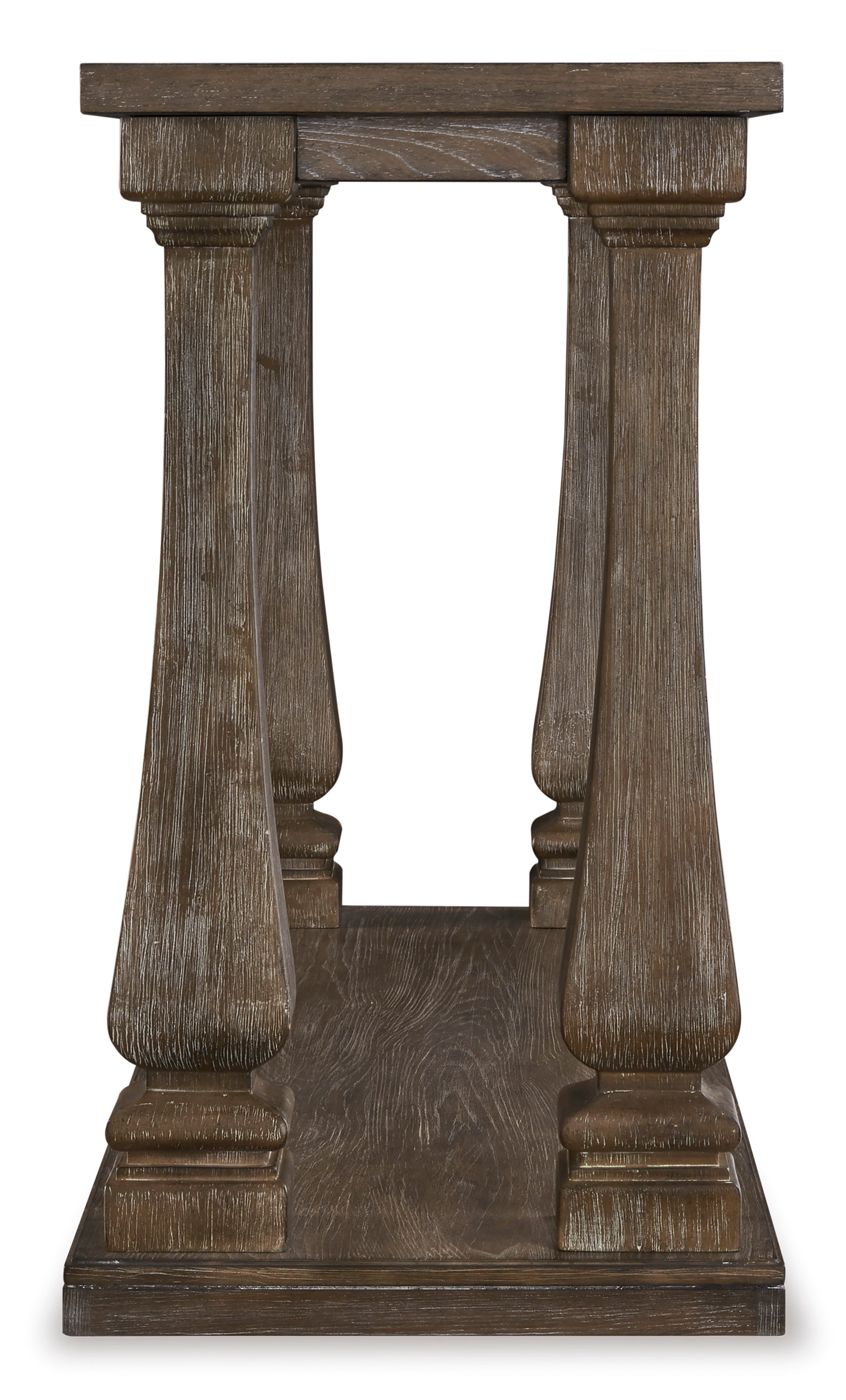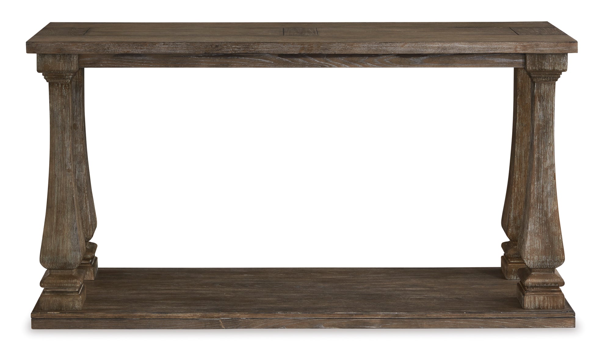 Homey. Hearty. Heavenly hued. Luring with a distressed weathered gray finish and square baluster legs set on a broad lower shelf for great presence, this sofa table is sure to make your homestead feel that much more like home. The look is beautified with elm veneers and a framed and plank-effect tabletop for a richly crafted masterpiece made for years of satisfaction.