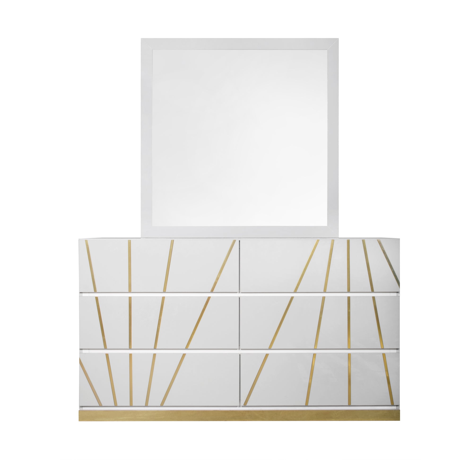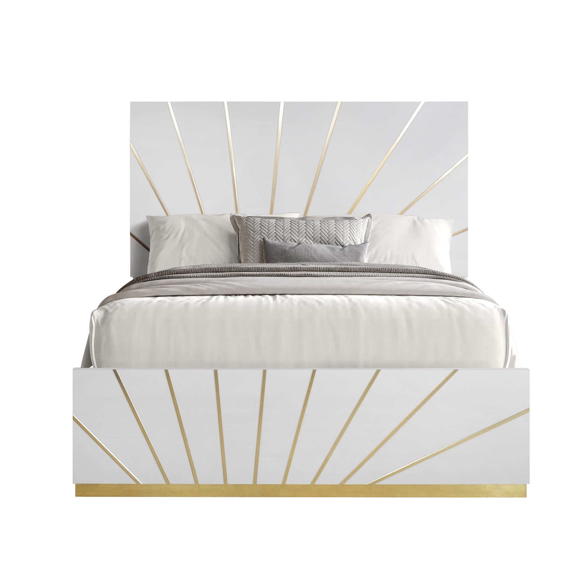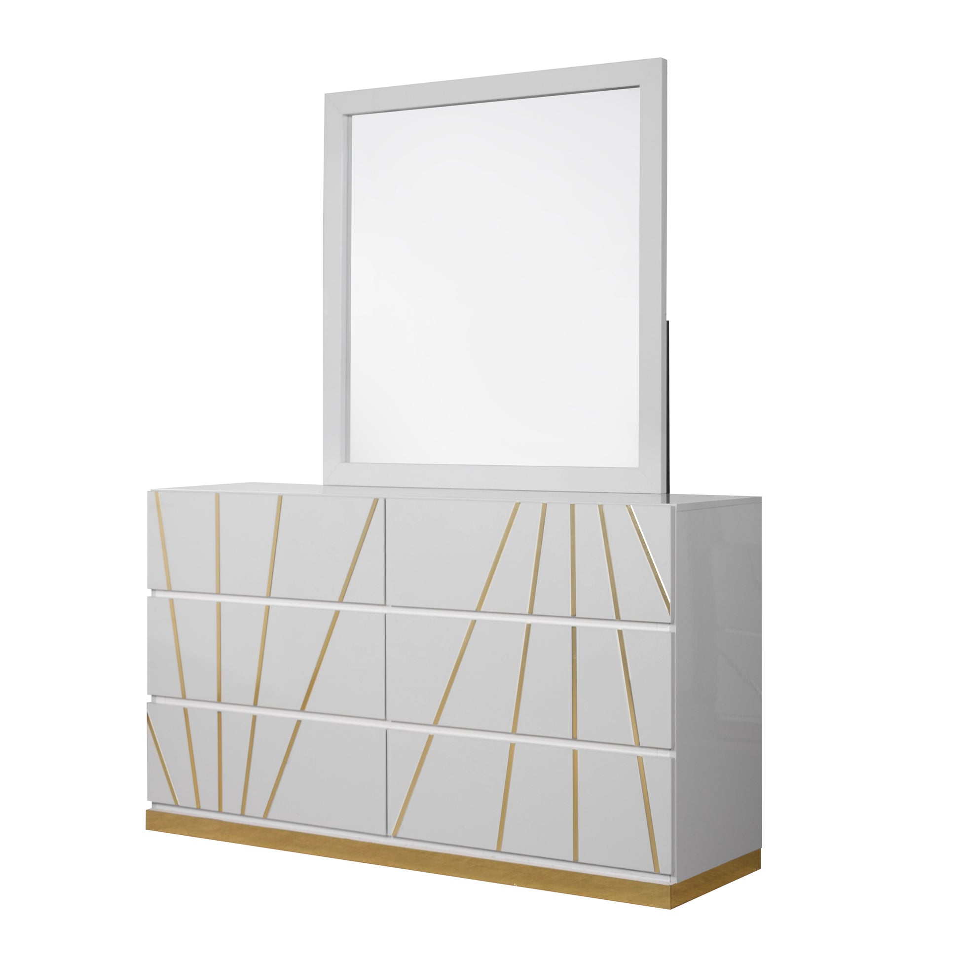 Features: Headboard & Mirror with LED, White w/Gold Accent, Ball Bearing Glides, High Gloss and Boxspring/Foundation Needed