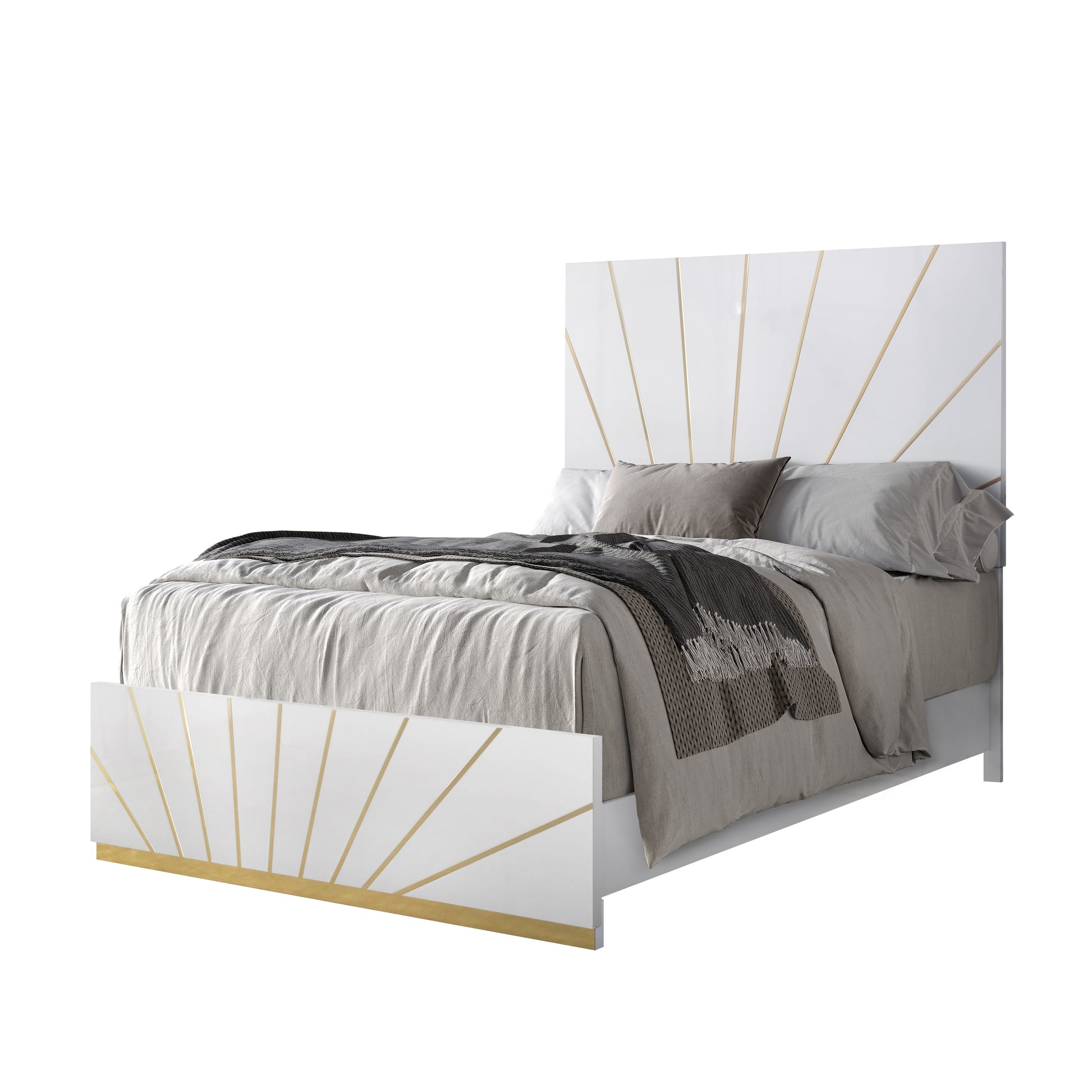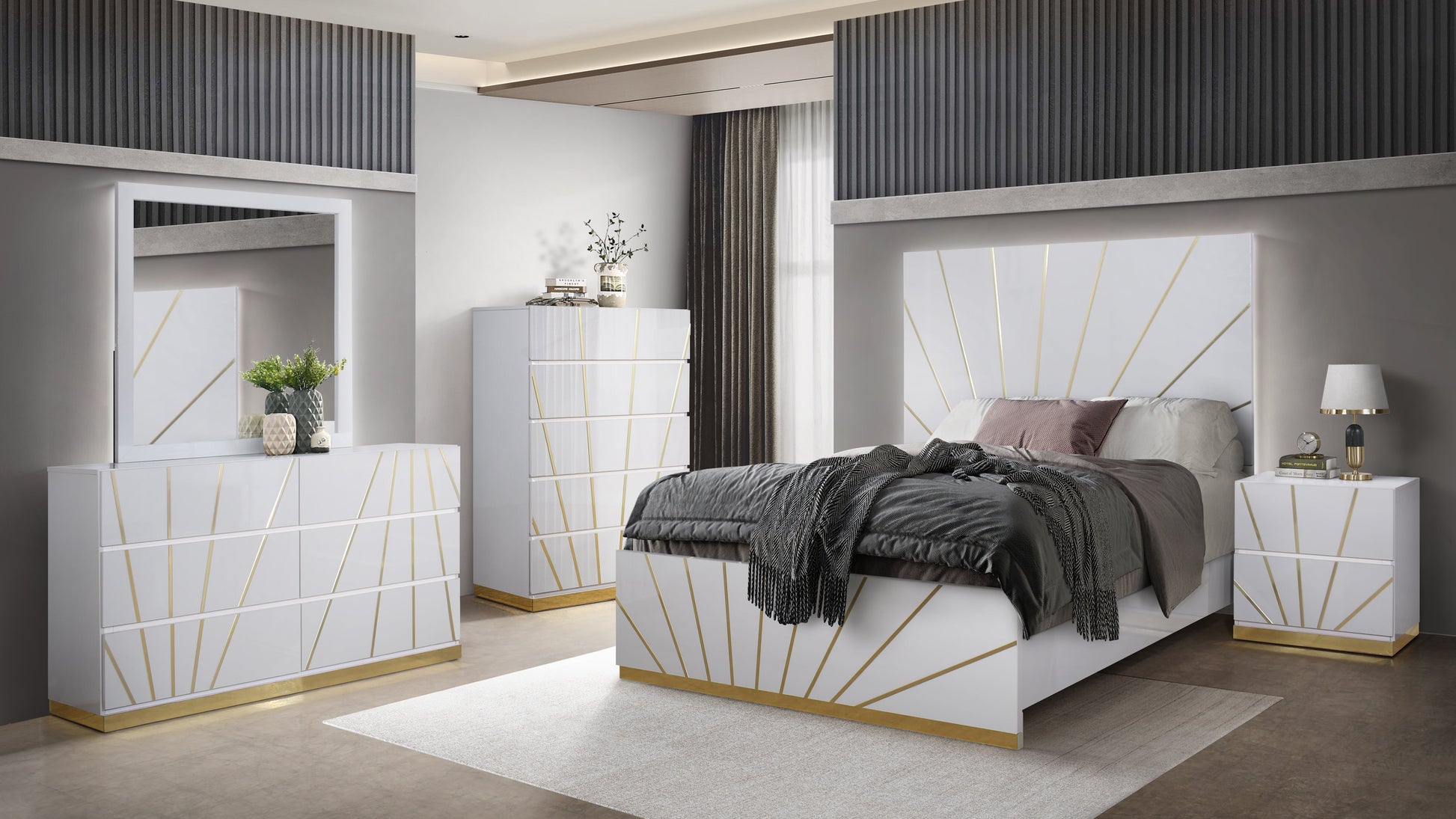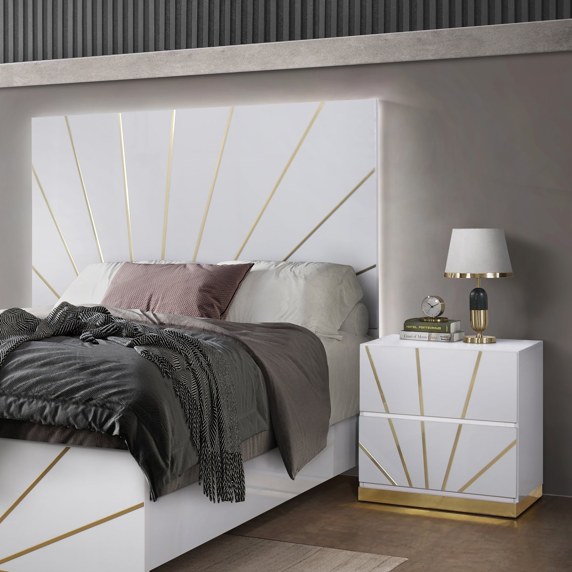 Features: Headboard & Mirror with LED, White w/Gold Accent, Ball Bearing Glides, High Gloss and Boxspring/Foundation Needed