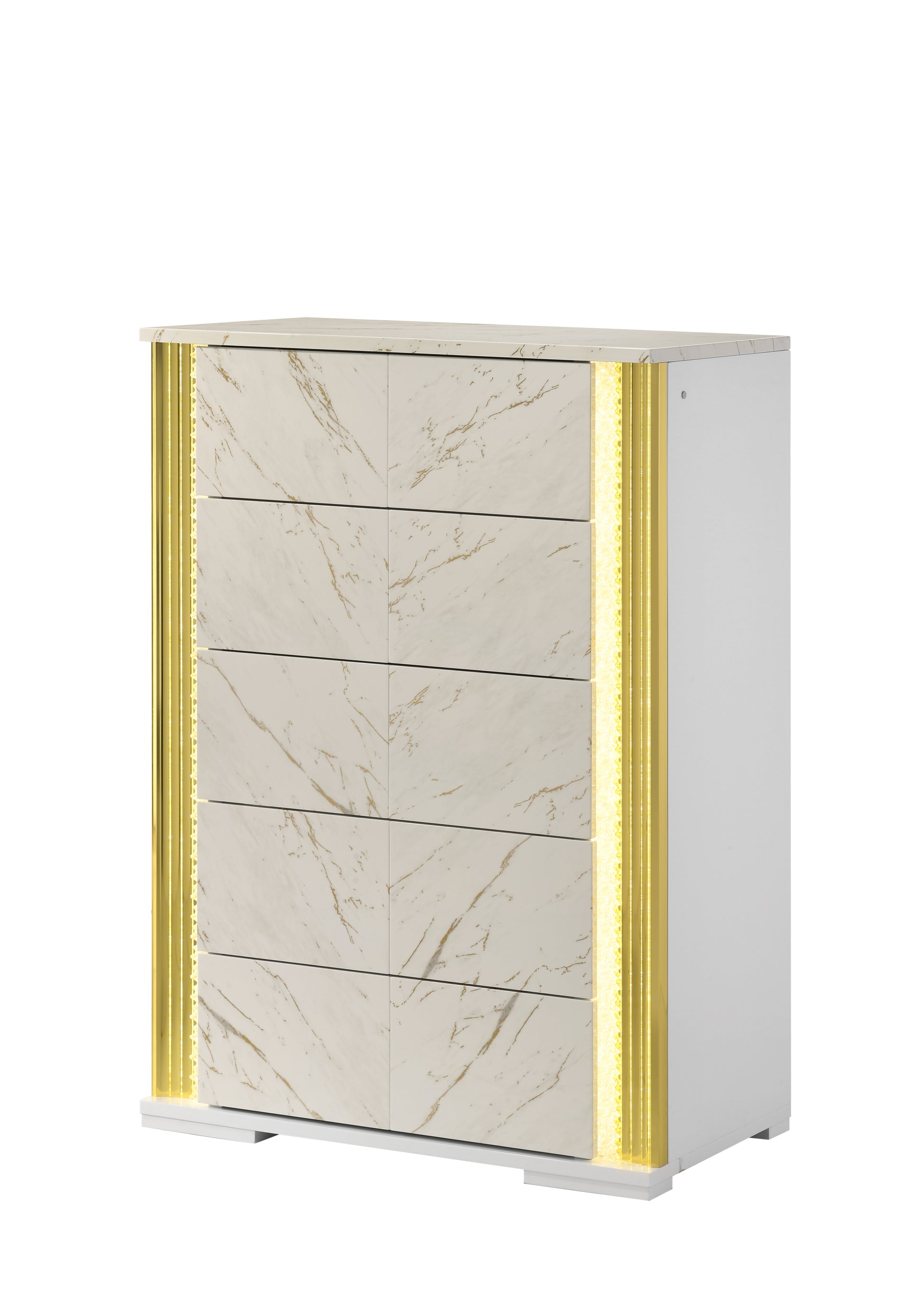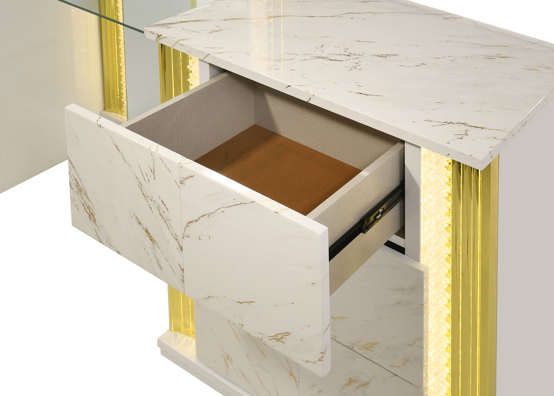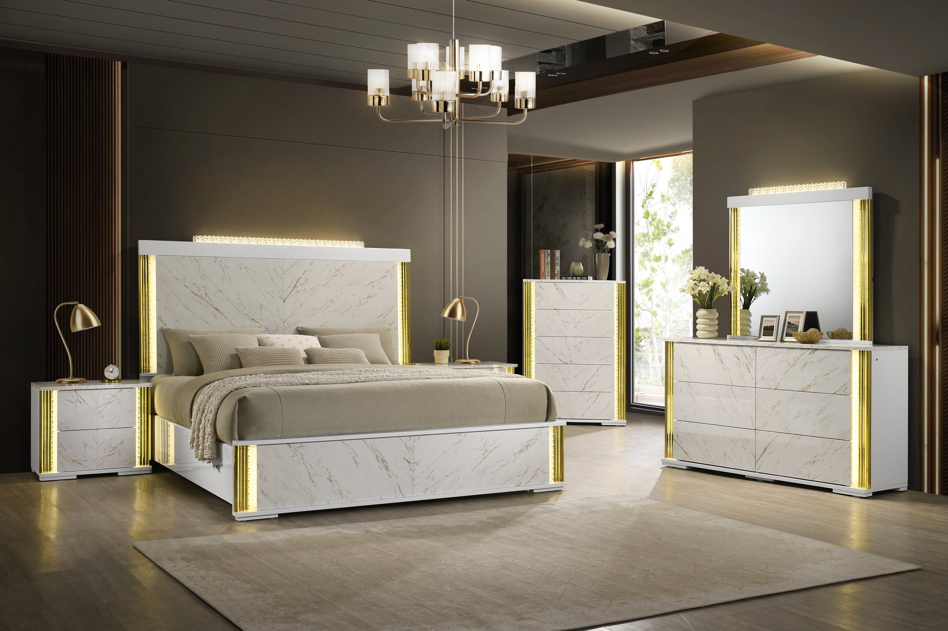 Elevate your sleep sanctuary with the Mika Collection, where high-fashion design meets ambient technology. This collection is defined by its striking faux-white marble finish, accented by warm gold veining and integrated LED lighting that transforms your bedroom into a high-end luxury suite.