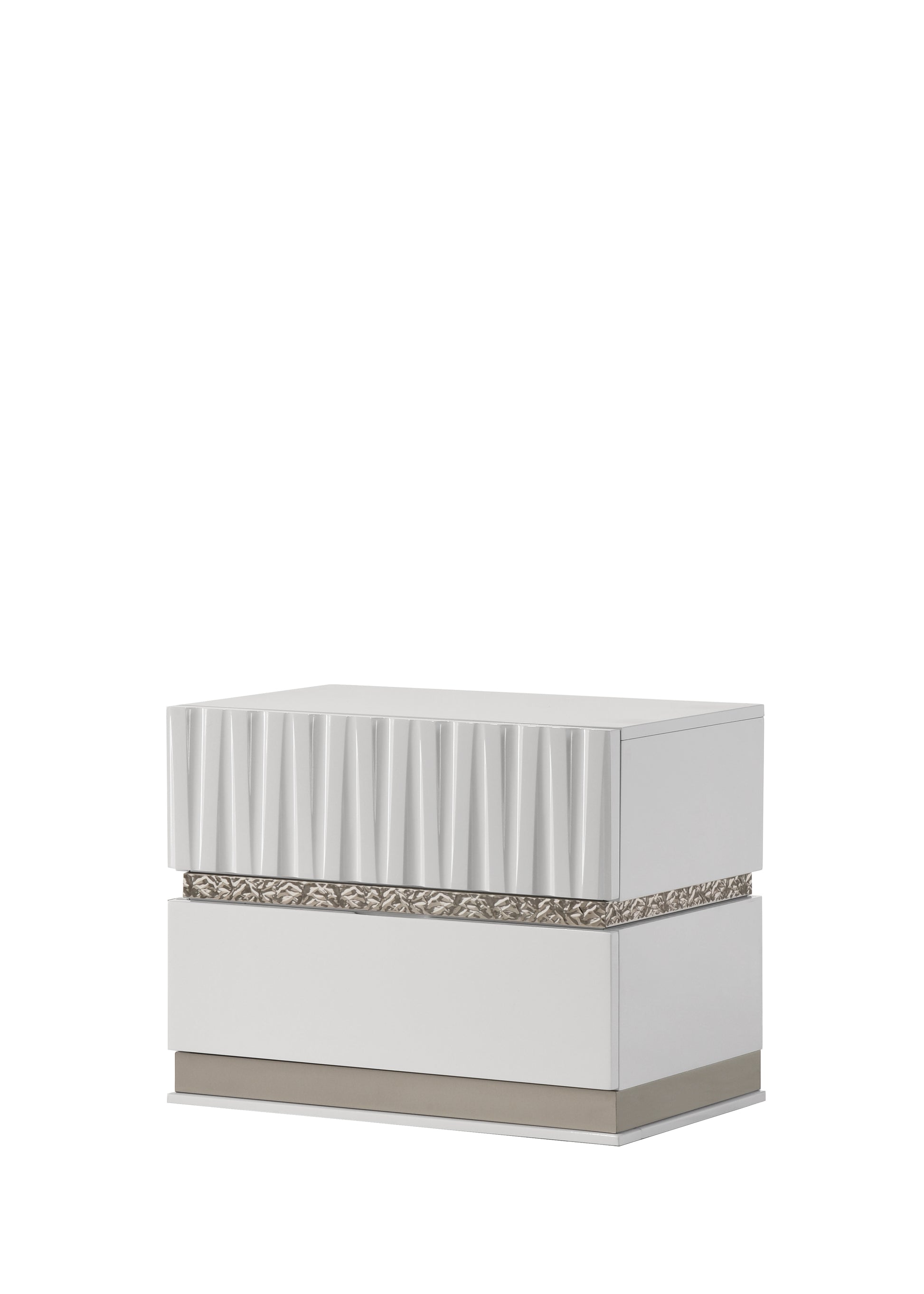 - Vertical Fluted Texturing: A distinctive feature of this model is the deep vertical fluting found on the headboard, footboard, and the top drawers of all case goods. This texture adds architectural depth to the high-gloss finish.