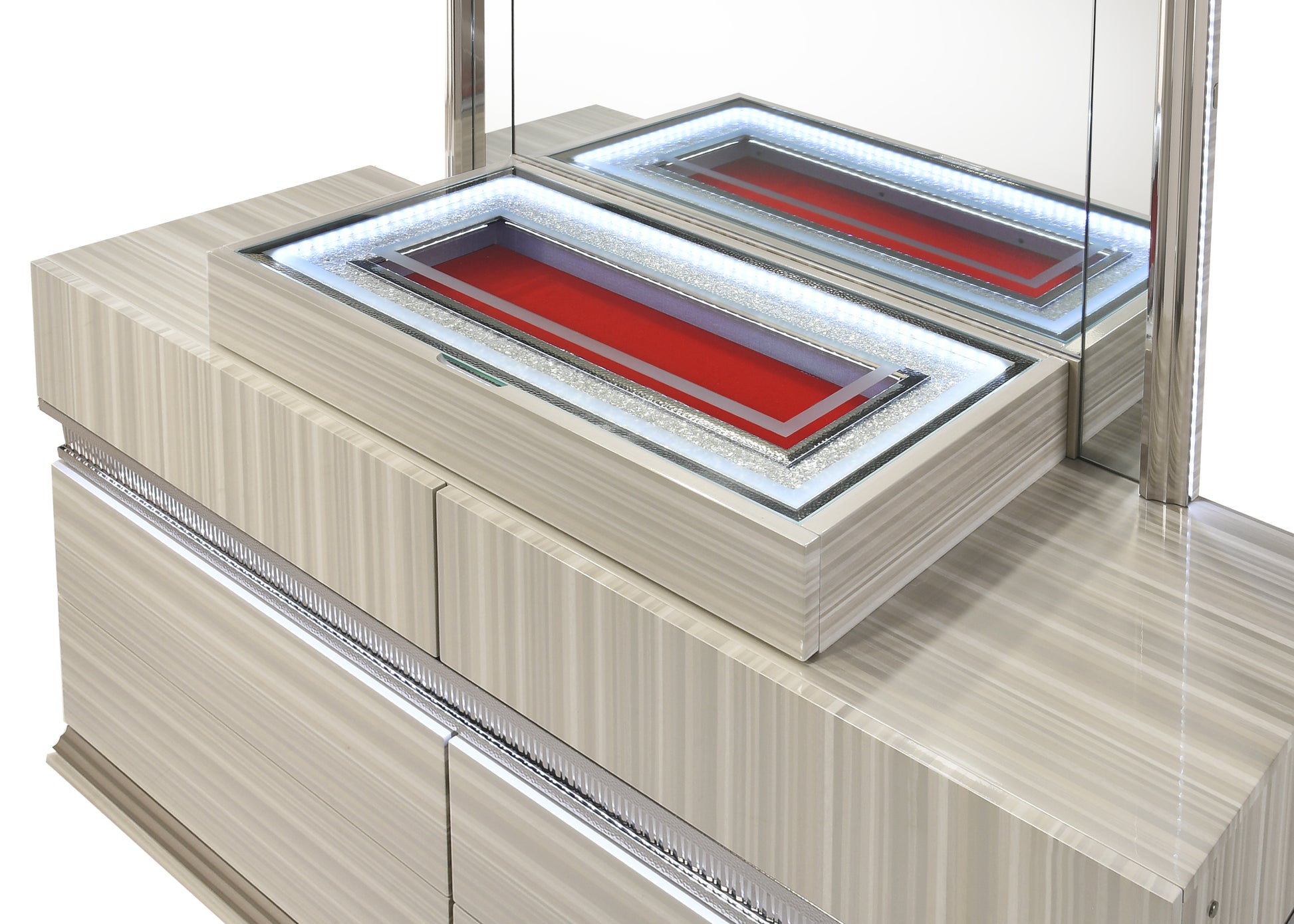 - Signature Jewelry Drawer: The dresser features a specialized, top jewelry case with a glass viewing top, bright LED internal lighting, and a vibrant red felt lining to elegantly organize and display your valuables.