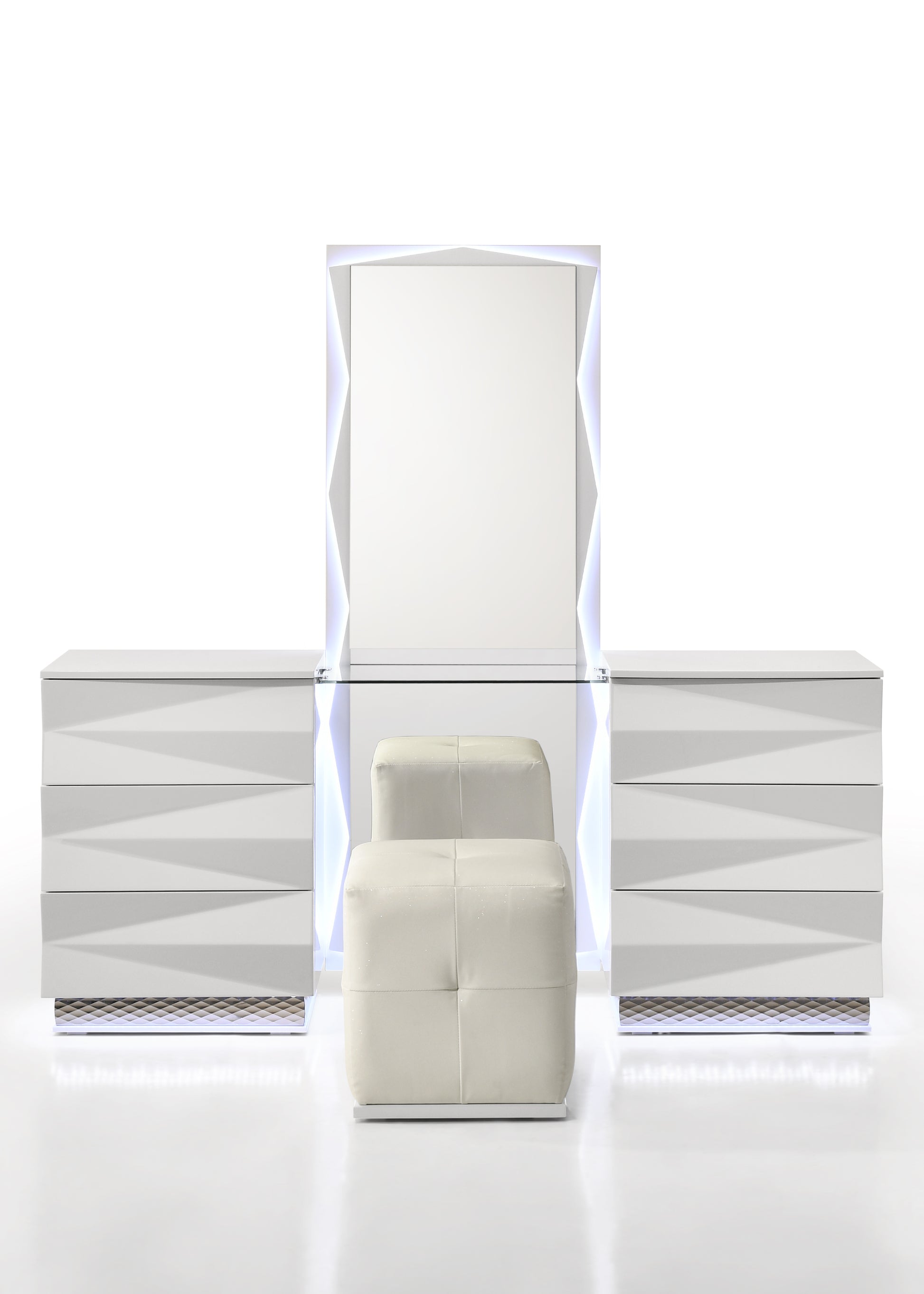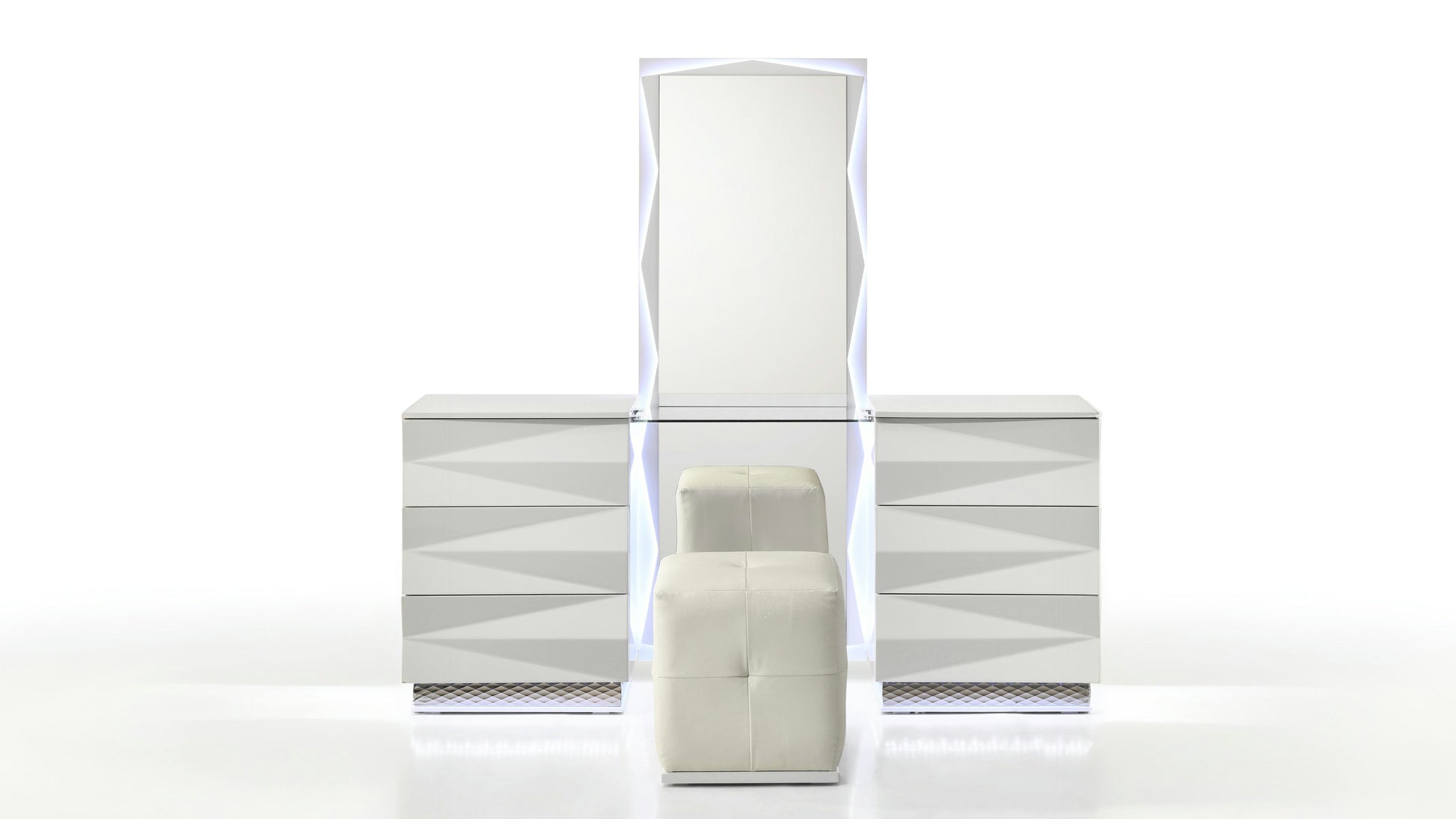 - Sophisticated Accents: The vanity is anchored by a diamond-patterned chrome base that reflects the ambient floor lighting for a truly immersive atmosphere.