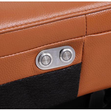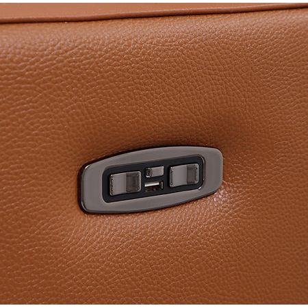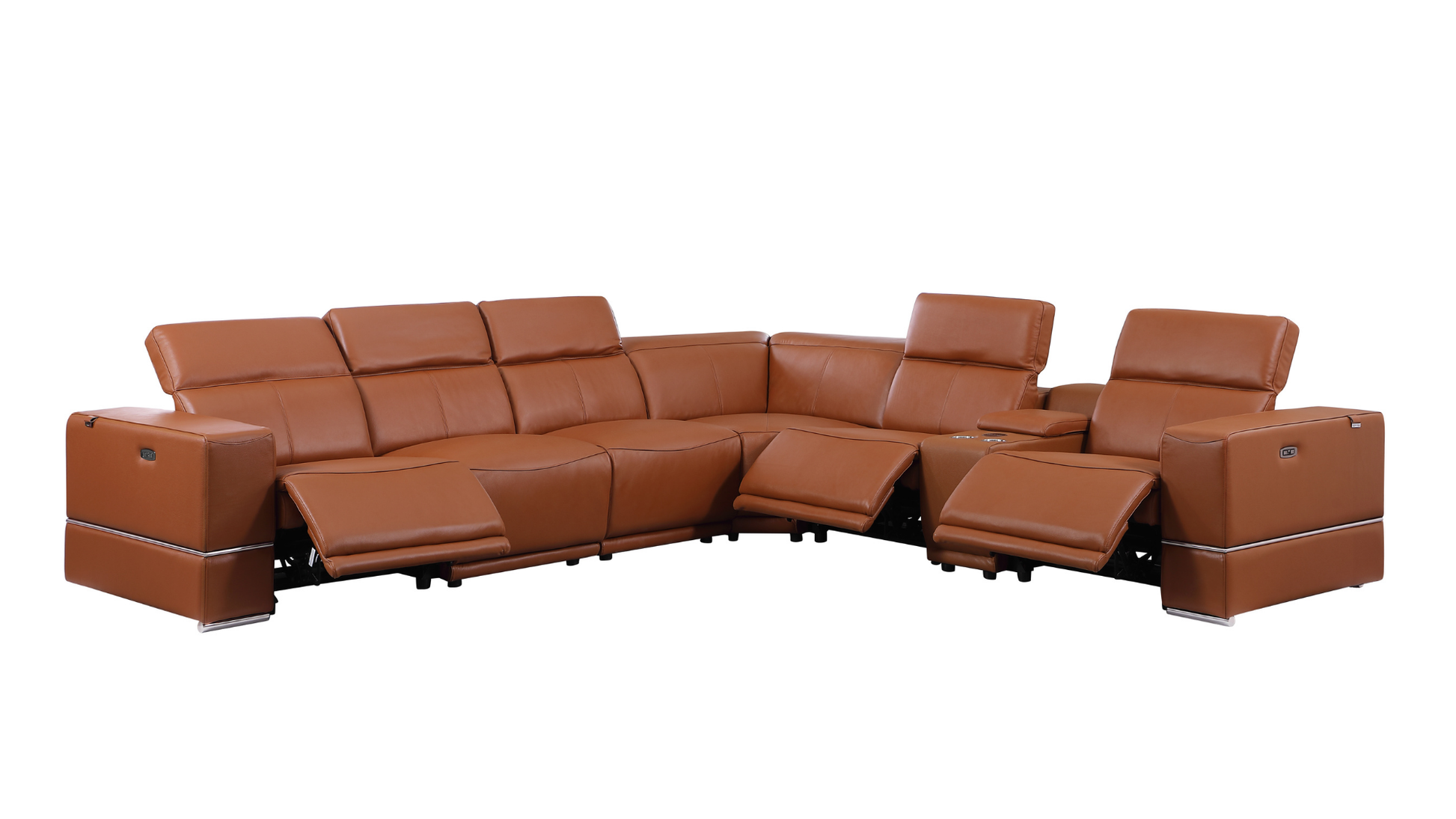 Discover the Franco reclining sectional by New Era Innovations in sophisticated Carmel Italian leather match. This 7-piece set includes a left-arm facing and right-arm facing power recliner with power headrests, a wedge and two armless chairs with adjustable headrests, an armless power recliner, plus a console featuring storage, cupholders, and a wireless charger. Its modular design allows you to customize the arrangement to fit your space, adding a modern and luxurious touch to any room. Elevate your home with style and comfort.
