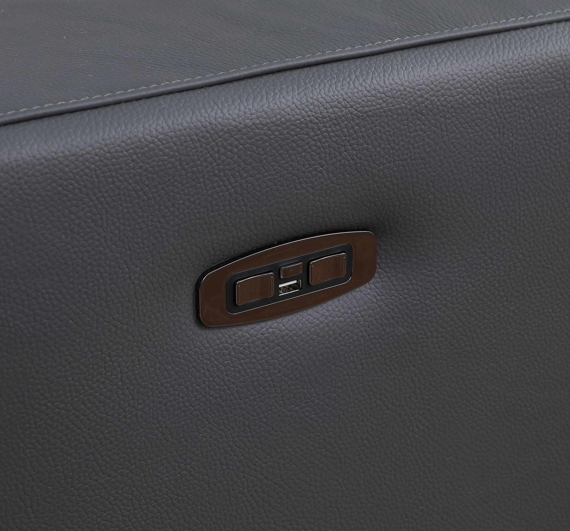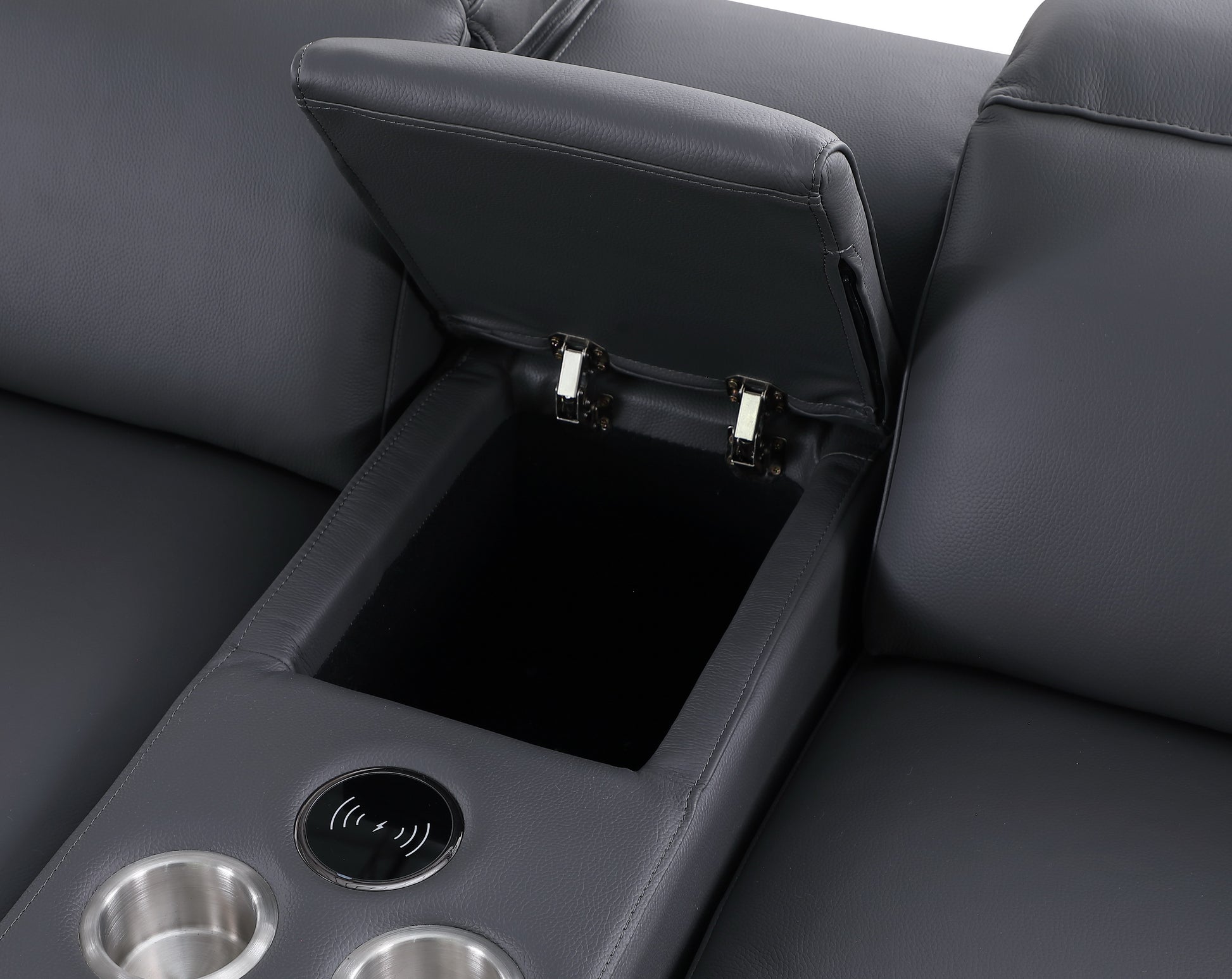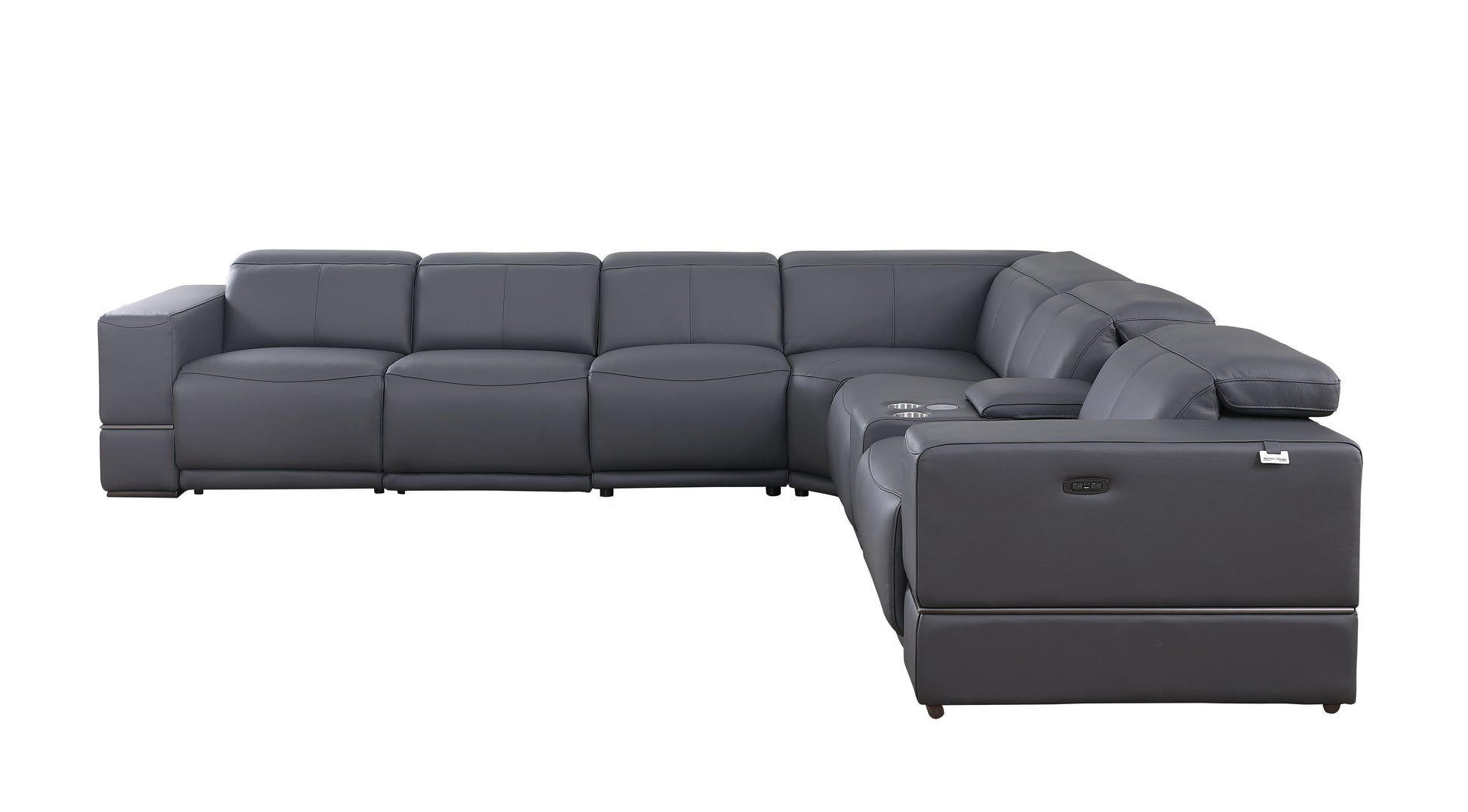 Discover the Franco reclining sectional by New Era Innovations in sophisticated dark grey Italian leather match. This 7-piece set includes a left-arm facing and right-arm facing power recliner with power headrests, a wedge and two armless chairs with adjustable headrests, an armless power recliner, plus a console featuring storage, cupholders, and a wireless charger. Its modular design allows you to customize the arrangement to fit your space, adding a modern and luxurious touch to any room. Elevate your home with style and comfort.