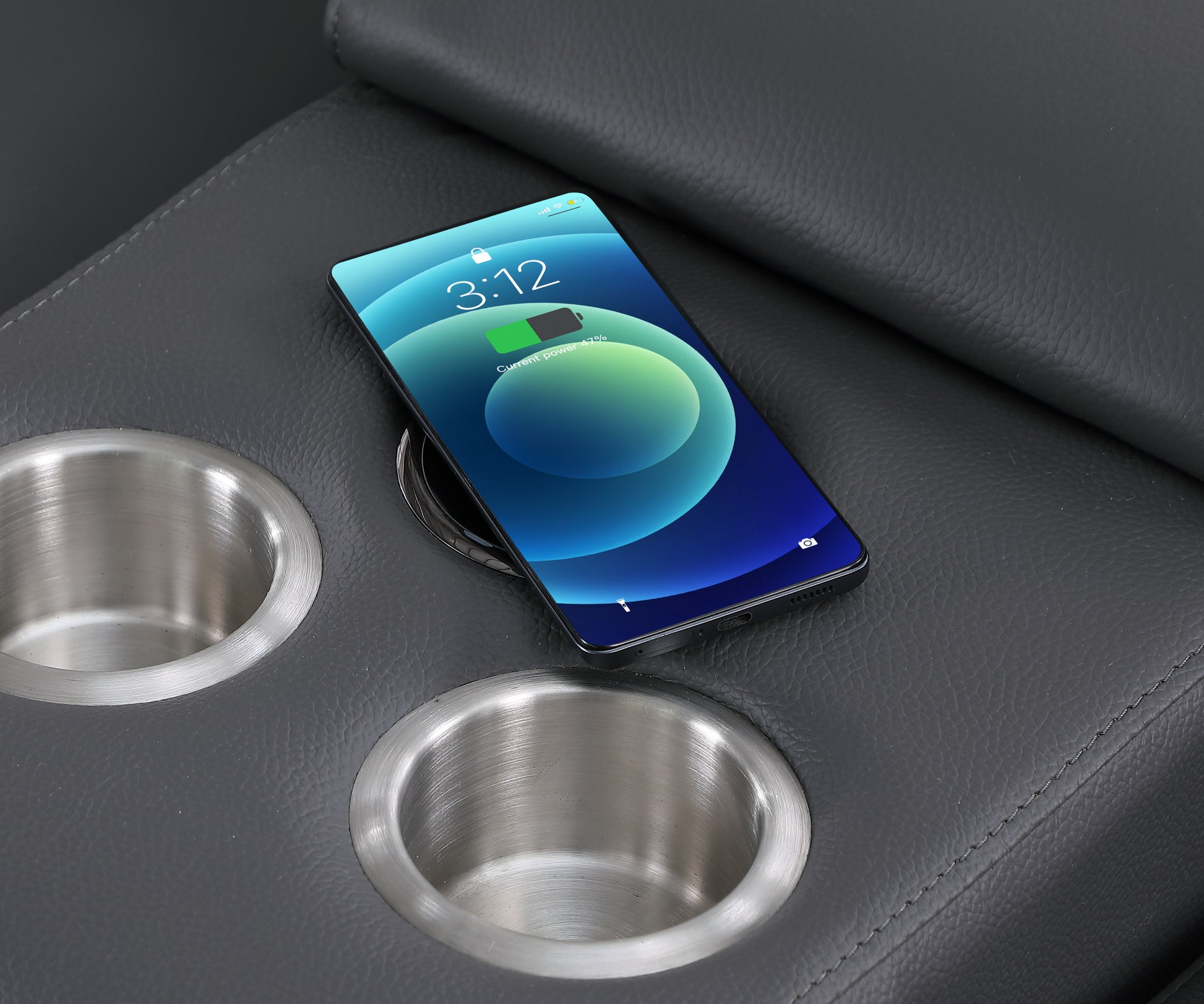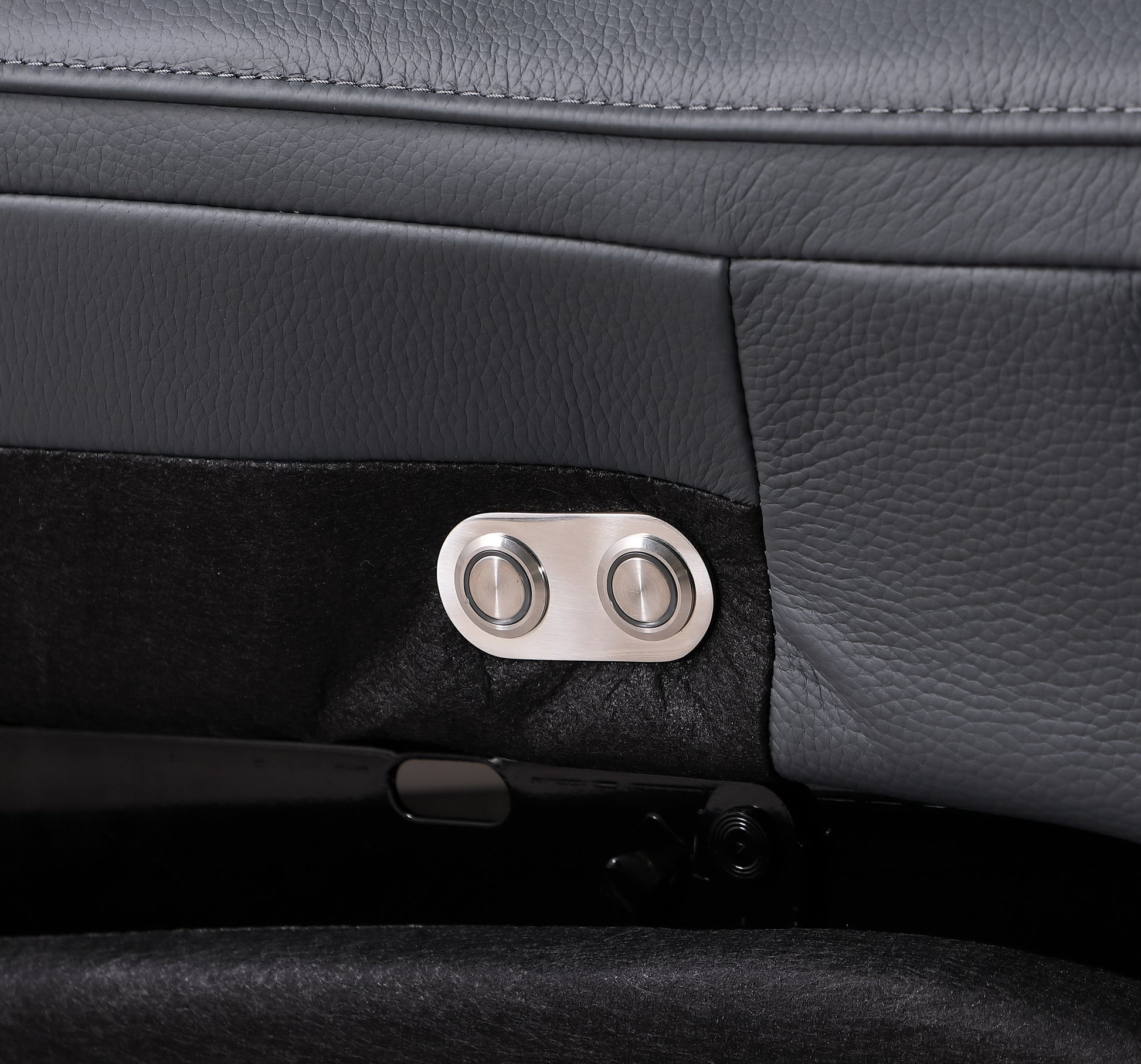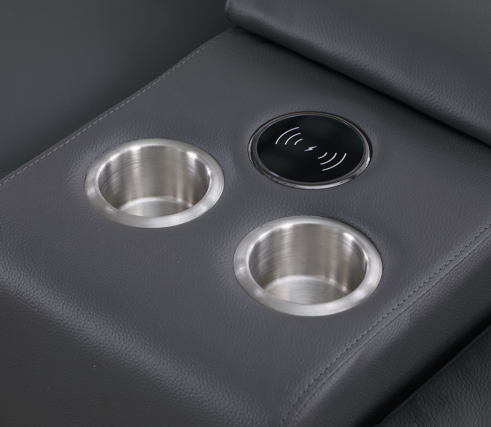 Discover the Franco reclining sectional by New Era Innovations in sophisticated dark grey Italian leather match. This 7-piece set includes a left-arm facing and right-arm facing power recliner with power headrests, a wedge and two armless chairs with adjustable headrests, an armless power recliner, plus a console featuring storage, cupholders, and a wireless charger. Its modular design allows you to customize the arrangement to fit your space, adding a modern and luxurious touch to any room. Elevate your home with style and comfort.
