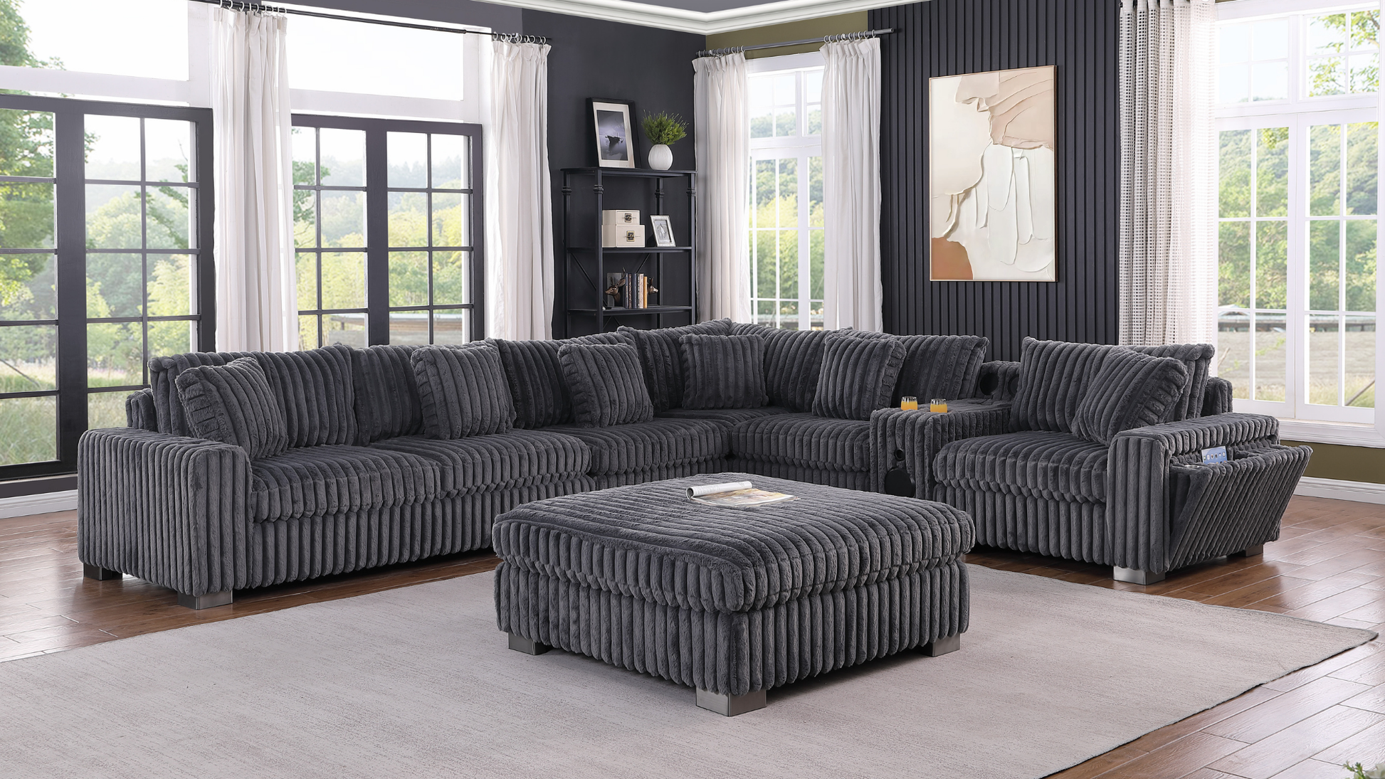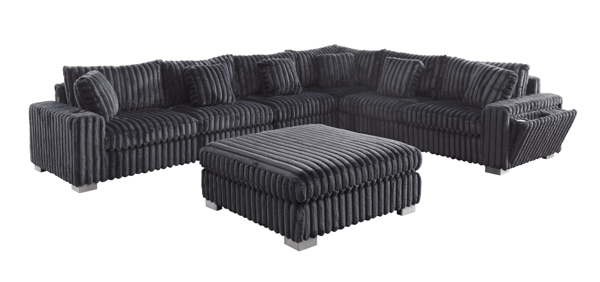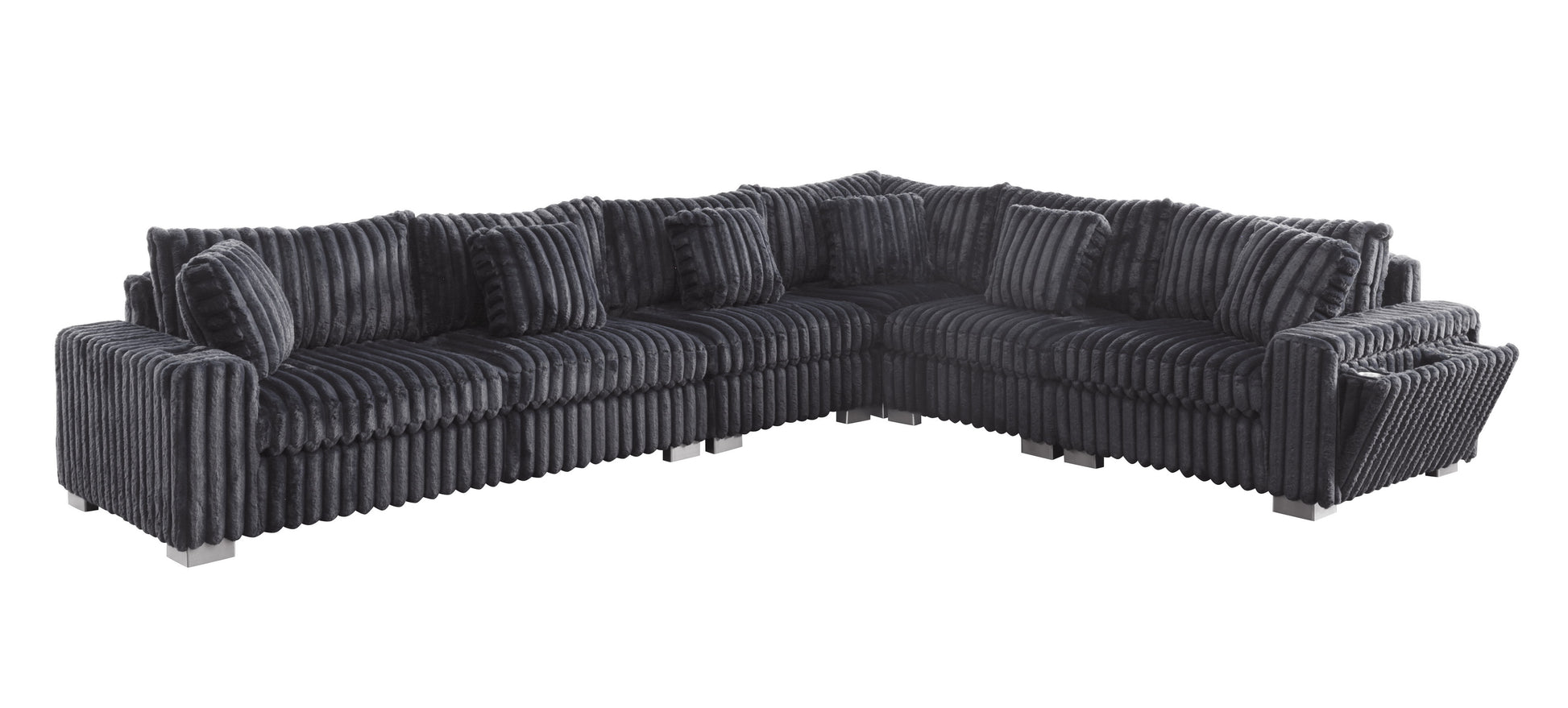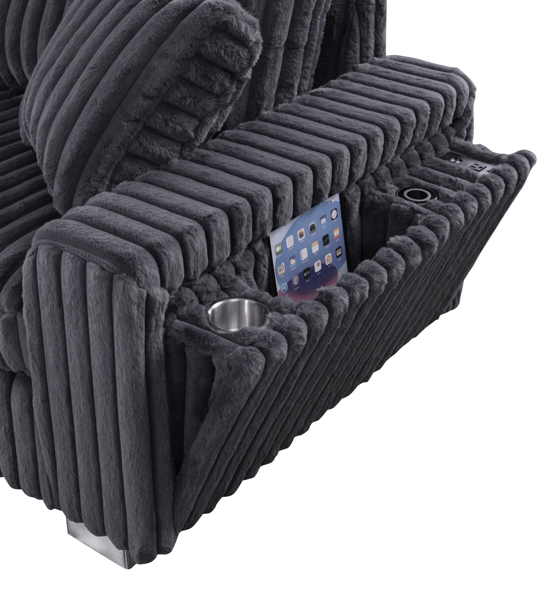 The S329 Snuggle Station transforms your living room into the ultimate entertainment hub. This grey sectional features a LAF 2-seater with stainless steel cupholder, a tech-forward console equipped with Bluetooth speakers, wireless charging, and multiple connectivity ports (AUX, USB, Type C), plus a RAF 1-seater with integrated storage, cupholder, wireless charger, USB port, and power outlet. Stay connected, charged, and comfortable all in one sophisticated piece. Perfect for movie nights, gaming sessions, or simply relaxing with everything you need within arm's reach.