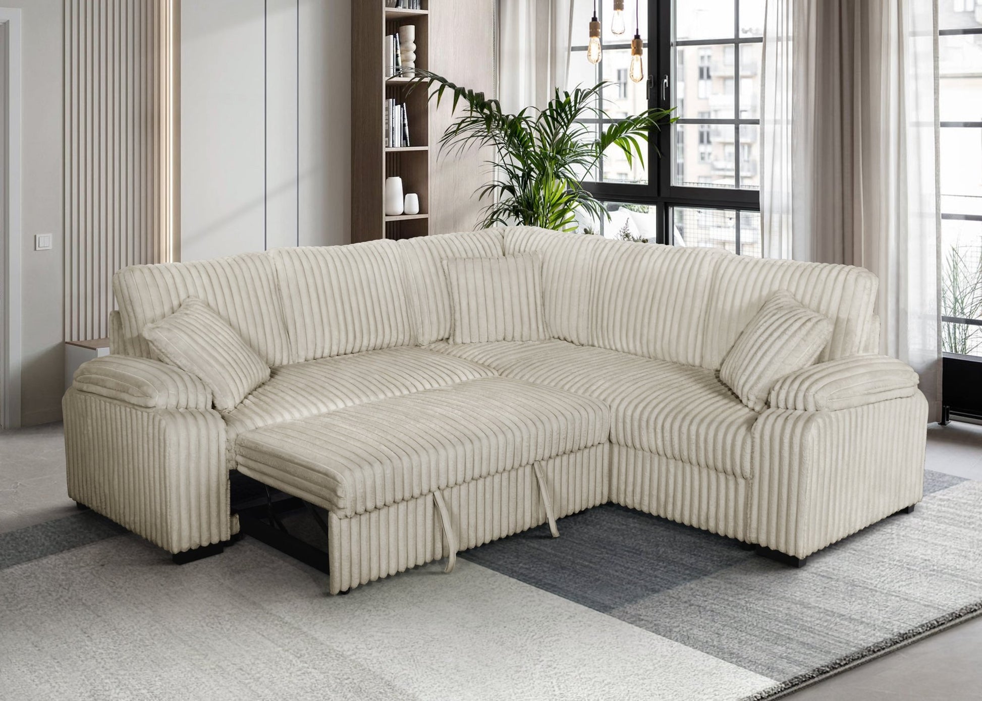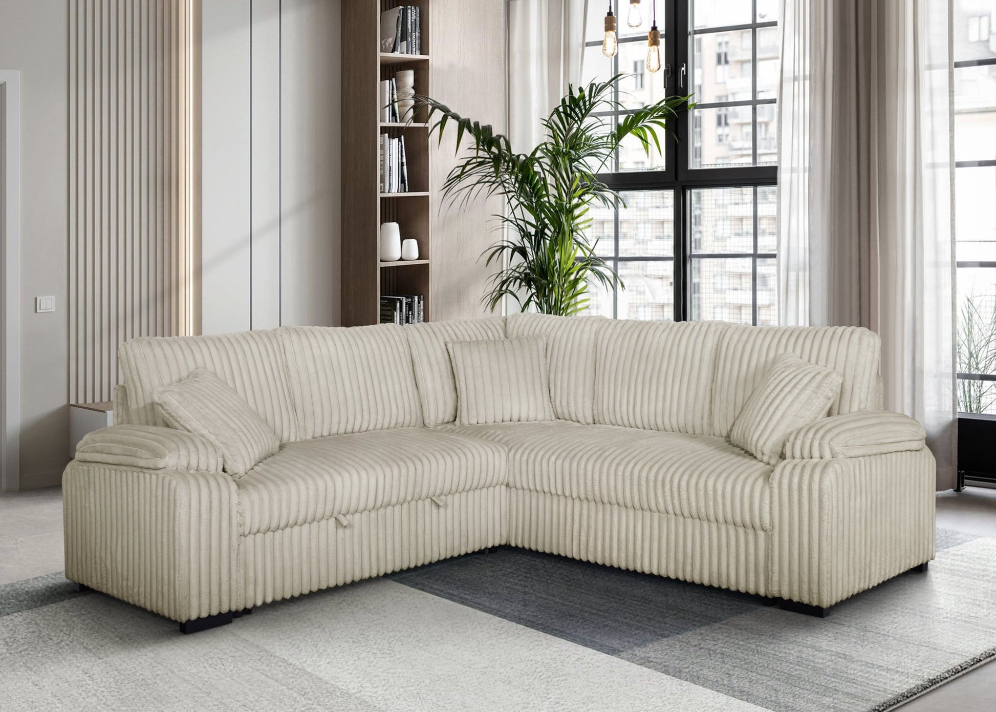 Introducing the S3662 sectional from the Neeha Collection by New Era Innovations in a stylish cream hue. Featuring a modern design crafted with soft corduroy fabric, this comfortable sectional includes a convenient pullout bed and three matching pillows, making it an ideal addition to your home for both relaxation and functionality.