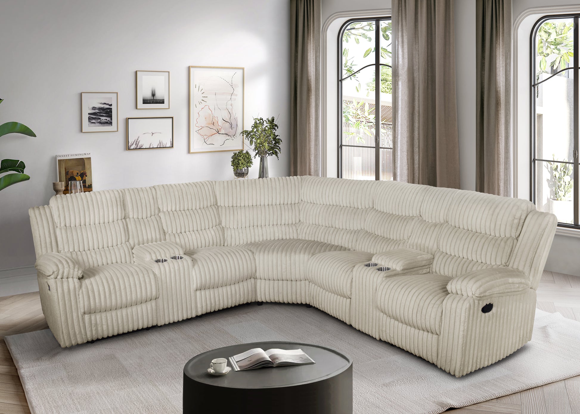 Experience the S3672 from the Calantha collection by New Era Innovations in an elegant cream color. Made with soft corduroy fabric, this stylish and comfortable piece features 2 recliners, 2 storage console with 4 stainless steel cupholders, perfect for relaxing in a modern living room. Elevate your space with both comfort and contemporary design.