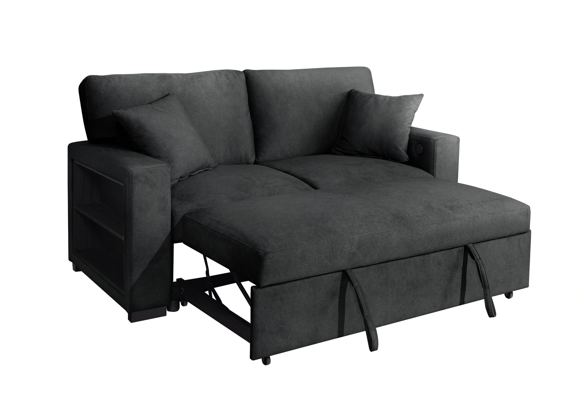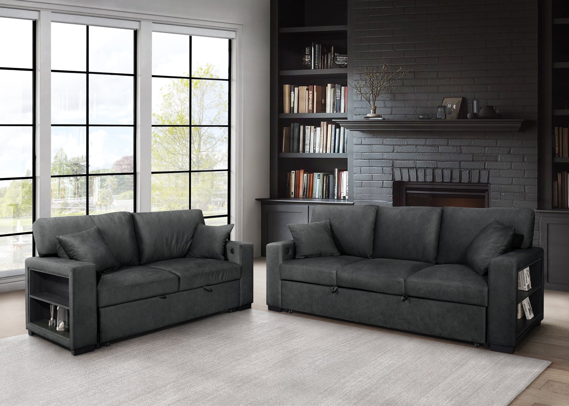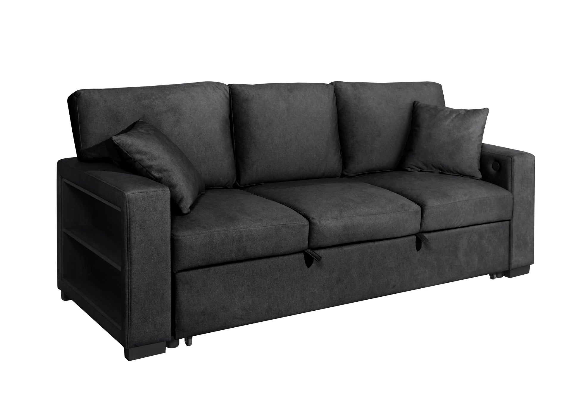 Experience modern comfort with the S3690 Bexley, a stunning black fabric sofa and loveseat designed for today's lifestyle. Built-in bookcases on both arms provide smart storage for books, plants, or décor, while integrated USB and Type C ports keep your devices powered throughout the day. The sofa features a drop-down table with cupholders for convenient refreshments, and a hidden pull-out sleeper bed welcomes overnight guests. Wrapped in premium fabric and dressed in ordinating pillows, this thoughtfully engineered sectional transforms your living room into a hub of style, comfort, and functionality.