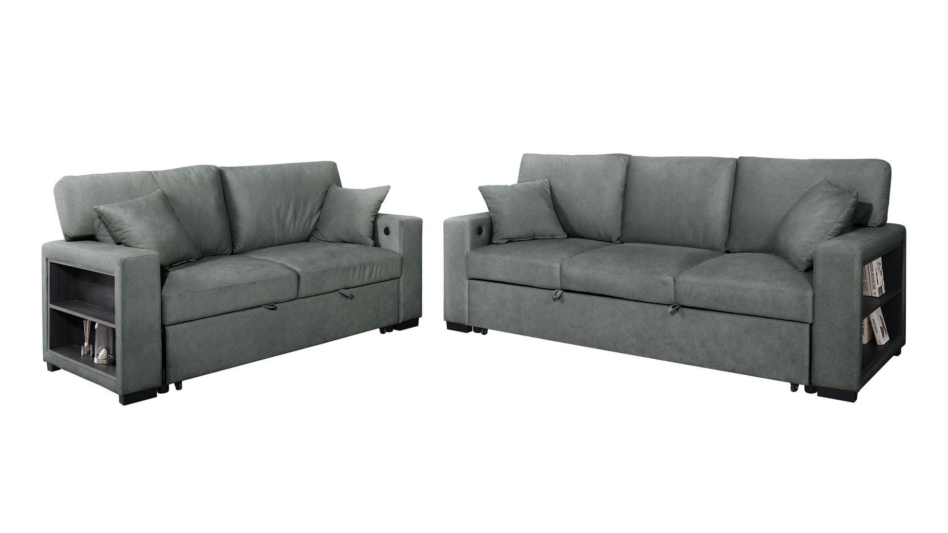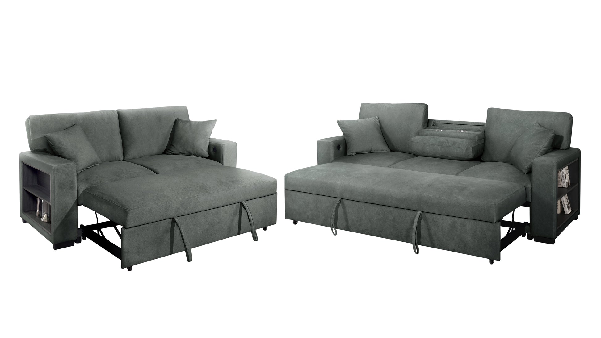 Experience modern comfort with the S3690 Bexley, a stunning grey fabric sofa and loveseat designed for today's lifestyle. Built-in bookcases on both arms provide smart storage for books, plants, or décor, while integrated USB and Type C ports keep your devices powered throughout the day. The sofa features a drop-down table with cupholders for convenient refreshments, and a hidden pull-out sleeper bed welcomes overnight guests. Wrapped in premium fabric and dressed in ordinating pillows, this thoughtfully engineered sectional transforms your living room into a hub of style, comfort, and functionality.
