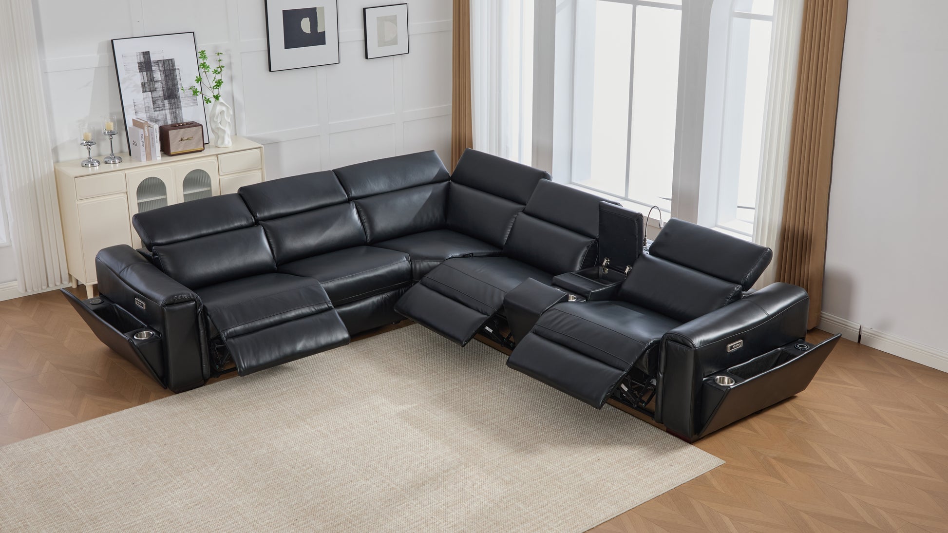 Experience ultimate comfort and convenience with the S681 Divani Power Sectional. This premium seating solution features two power recliners and one manual recliner, each with adjustable headrests for personalized support. Enjoy seamless entertainment with built-in Bluetooth speakers and reading lamps, while wireless chargers and USB ports keep your devices powered. Dual consoles offer hidden cup holders and storage pockets, plus additional storage compartments on each side—everything you need for the perfect relaxation setup.
