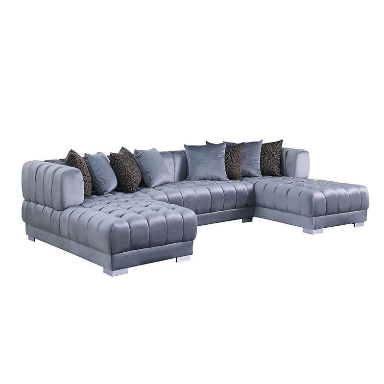 Elevate your living space with the S8155 Dasha sectional in sleek grey velvet, complemented by elegant silver legs. This luxurious piece offers both comfort and style, featuring plush velvet upholstery and included accent pillows for added coziness. Its striking design makes it the perfect centerpiece to transform any room into a sophisticated retreat.